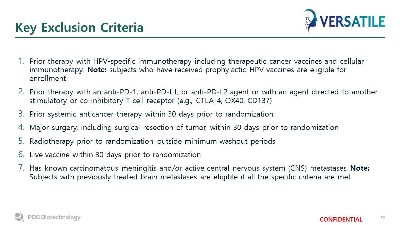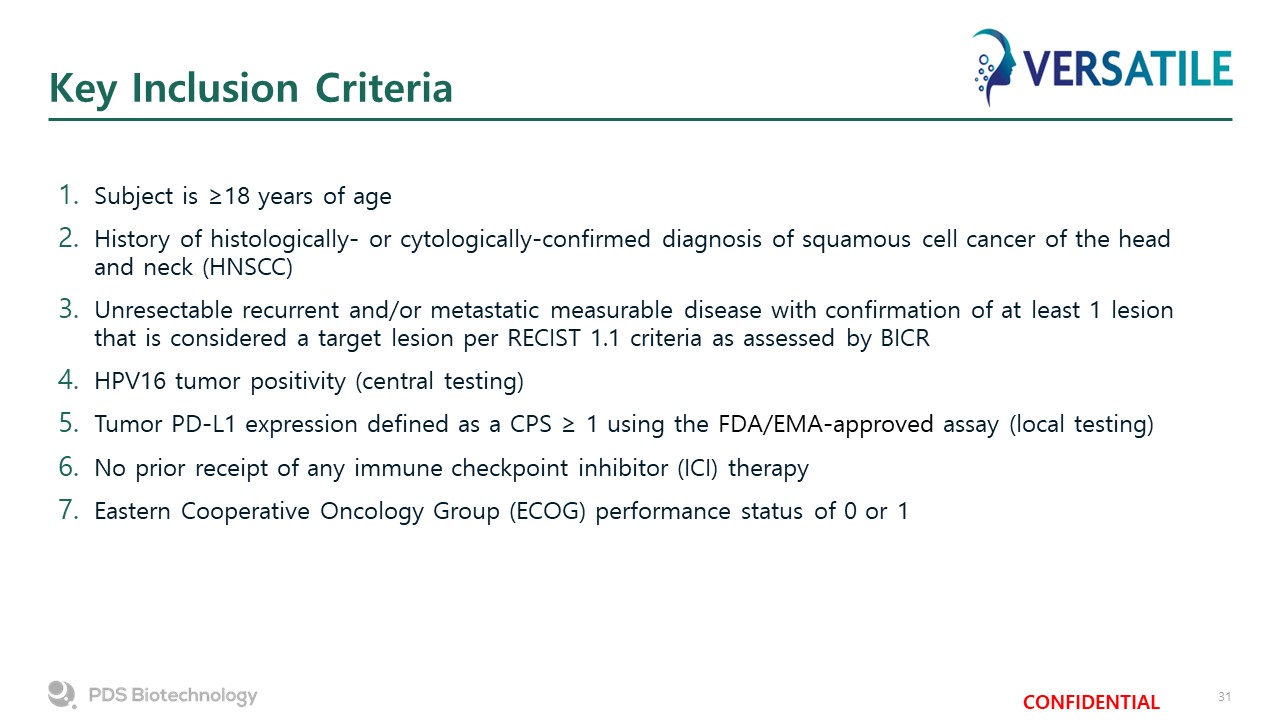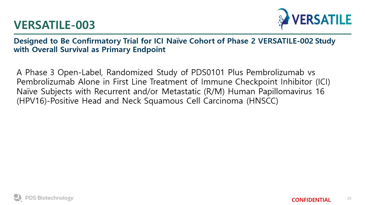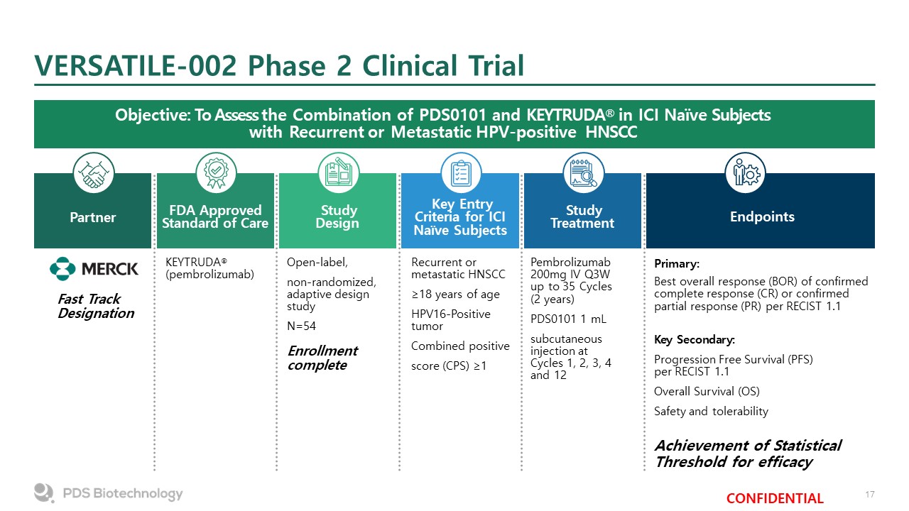 VERSATILE-002 Phase 2 Clinical Trial  Objective: To Assess the Combination of PDS0101 and KEYTRUDA® in ICI Naïve Subjects with Recurrent or Metastatic HPV-positive HNSCC  KEYTRUDA®(pembrolizumab)  FDA Approved Standard of Care  Partner  StudyDesign  Open-label,  non-randomized, adaptive design study  N=54  Enrollment complete  Key Entry Criteria for ICI Naïve Subjects  Recurrent or metastatic HNSCC  ≥18 years of age  HPV16-Positive tumor  Combined positive  score (CPS) ≥1  Pembrolizumab 200mg IV Q3W up to 35 Cycles (2 years)  PDS0101 1 mL  subcutaneous injection at Cycles 1, 2, 3, 4 and 12  Study Treatment  Primary:  Best overall response (BOR) of confirmed complete response (CR) or confirmed partial response (PR) per RECIST 1.1  Key Secondary:  Progression Free Survival (PFS) per RECIST 1.1   Overall Survival (OS)  Safety and tolerability  Achievement of Statistical Threshold for efficacy  Endpoints  Fast Track Designation
