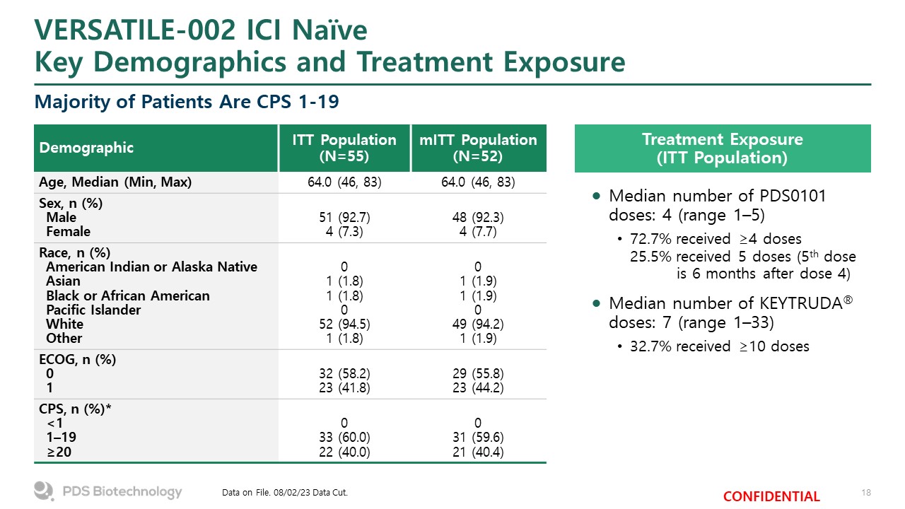 VERSATILE-002 ICI Naïve Key Demographics and Treatment Exposure  Majority of Patients Are CPS 1-19  Demographic  ITT Population (N=55)  mITT Population (N=52)  Age, Median (Min, Max)  64.0 (46, 83)  64.0 (46, 83)  Sex, n (%)  Male  Female     51 (92.7)  4 (7.3)     48 (92.3)  4 (7.7)  Race, n (%)  American Indian or Alaska Native  Asian  Black or African American  Pacific Islander  White  Other     0  1 (1.8)  1 (1.8)  0  52 (94.5)  1 (1.8)     0  1 (1.9)  1 (1.9)  0  49 (94.2)  1 (1.9)  ECOG, n (%)  0  1     32 (58.2)  23 (41.8)     29 (55.8)  23 (44.2)  CPS, n (%)*  <1  1–19  ≥20     0  33 (60.0)  22 (40.0)     0  31 (59.6)  21 (40.4)  Data on File. 08/02/23 Data Cut.  Treatment Exposure(ITT Population)  Median number of PDS0101 doses: 4 (range 1–5)  72.7% received ≥4 doses25.5% received 5 doses (5th dose is 6 months after dose 4)  Median number of KEYTRUDA® doses: 7 (range 1–33)  32.7% received ≥10 doses