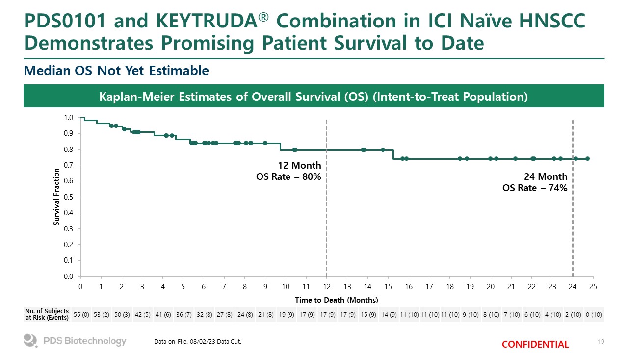 PDS0101 and KEYTRUDA® Combination in ICI Naïve HNSCC Demonstrates Promising Patient Survival to Date  Median OS Not Yet Estimable  Data on File. 08/02/23 Data Cut.  Kaplan-Meier Estimates of Overall Survival (OS) (Intent-to-Treat Population)  No. of Subjects at Risk (Events)   55 (0)  53 (2)  50 (3)  42 (5)  41 (6)  36 (7)  32 (8)  27 (8)  24 (8)  21 (8)  19 (9)  17 (9)  17 (9)  17 (9)  15 (9)  14 (9)  11 (10)  11 (10)  11 (10)  9 (10)  8 (10)  7 (10)  6 (10)  4 (10)  2 (10)  0 (10)  12 Month OS Rate – 80%  24 Month OS Rate – 74%
