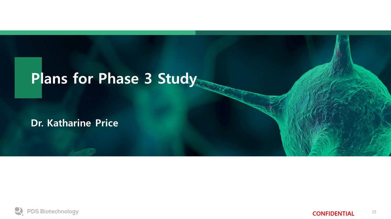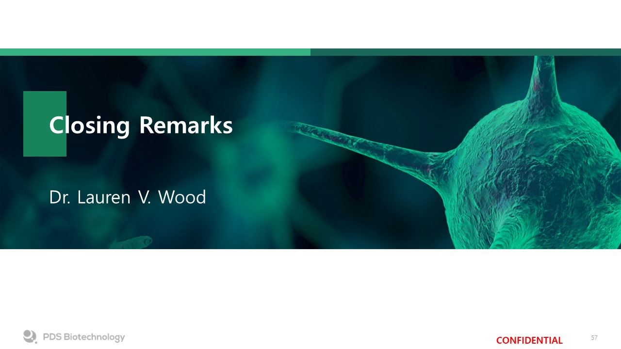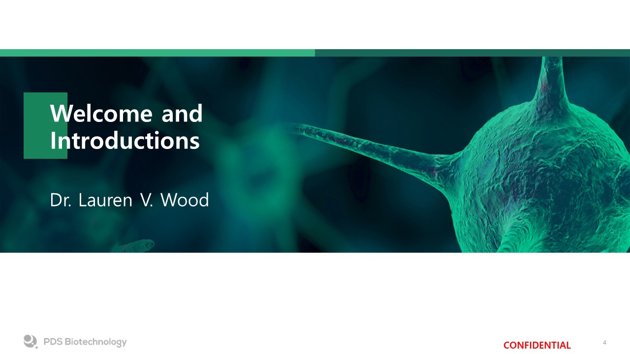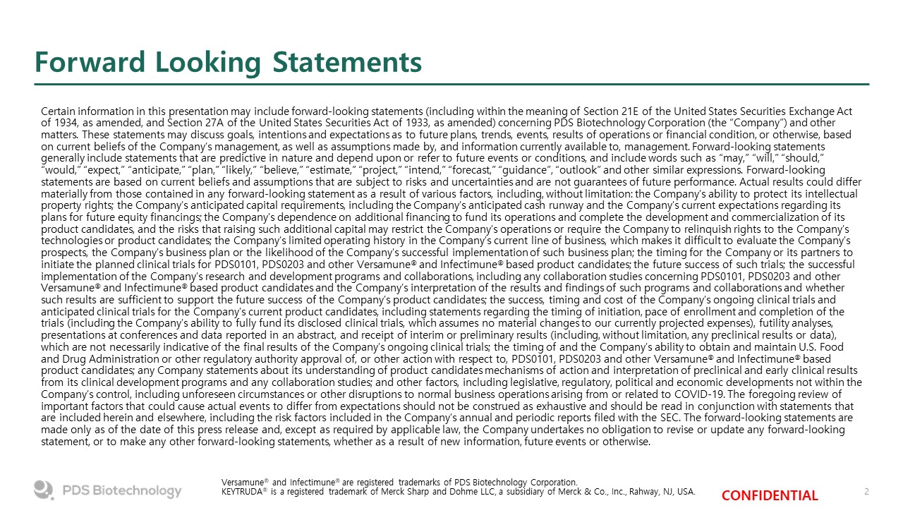 Forward Looking Statements  Versamune® and Infectimune® are registered trademarks of PDS Biotechnology Corporation.KEYTRUDA® is a registered trademark of Merck Sharp and Dohme LLC, a subsidiary of Merck & Co., Inc., Rahway, NJ, USA.  Certain information in this presentation may include forward-looking statements (including within the meaning of Section 21E of the United States Securities Exchange Act of 1934, as amended, and Section 27A of the United States Securities Act of 1933, as amended) concerning PDS Biotechnology Corporation (the “Company”) and other matters. These statements may discuss goals, intentions and expectations as to future plans, trends, events, results of operations or financial condition, or otherwise, based on current beliefs of the Company’s management, as well as assumptions made by, and information currently available to, management. Forward-looking statements generally include statements that are predictive in nature and depend upon or refer to future events or conditions, and include words such as “may,” “will,” “should,” “would,” “expect,” “anticipate,” “plan,” “likely,” “believe,” “estimate,” “project,” “intend,” “forecast,” “guidance”, “outlook” and other similar expressions. Forward-looking statements are based on current beliefs and assumptions that are subject to risks and uncertainties and are not guarantees of future performance. Actual results could differ materially from those contained in any forward-looking statement as a result of various factors, including, without limitation: the Company’s ability to protect its intellectual property rights; the Company’s anticipated capital requirements, including the Company’s anticipated cash runway and the Company’s current expectations regarding its plans for future equity financings; the Company’s dependence on additional financing to fund its operations and complete the development and commercialization of its product candidates, and the risks that raising such additional capital may restrict the Company’s operations or require the Company to relinquish rights to the Company’s technologies or product candidates; the Company’s limited operating history in the Company’s current line of business, which makes it difficult to evaluate the Company’s prospects, the Company’s business plan or the likelihood of the Company’s successful implementation of such business plan; the timing for the Company or its partners to initiate the planned clinical trials for PDS0101, PDS0203 and other Versamune® and Infectimune® based product candidates; the future success of such trials; the successful implementation of the Company’s research and development programs and collaborations, including any collaboration studies concerning PDS0101, PDS0203 and other Versamune® and Infectimune® based product candidates and the Company’s interpretation of the results and findings of such programs and collaborations and whether such results are sufficient to support the future success of the Company’s product candidates; the success, timing and cost of the Company’s ongoing clinical trials and anticipated clinical trials for the Company’s current product candidates, including statements regarding the timing of initiation, pace of enrollment and completion of the trials (including the Company’s ability to fully fund its disclosed clinical trials, which assumes no material changes to our currently projected expenses), futility analyses, presentations at conferences and data reported in an abstract, and receipt of interim or preliminary results (including, without limitation, any preclinical results or data), which are not necessarily indicative of the final results of the Company’s ongoing clinical trials; the timing of and the Company’s ability to obtain and maintain U.S. Food and Drug Administration or other regulatory authority approval of, or other action with respect to, PDS0101, PDS0203 and other Versamune® and Infectimune® based product candidates; any Company statements about its understanding of product candidates mechanisms of action and interpretation of preclinical and early clinical results from its clinical development programs and any collaboration studies; and other factors, including legislative, regulatory, political and economic developments not within the Company’s control, including unforeseen circumstances or other disruptions to normal business operations arising from or related to COVID-19. The foregoing review of important factors that could cause actual events to differ from expectations should not be construed as exhaustive and should be read in conjunction with statements that are included herein and elsewhere, including the risk factors included in the Company’s annual and periodic reports filed with the SEC. The forward-looking statements are made only as of the date of this press release and, except as required by applicable law, the Company undertakes no obligation to revise or update any forward-looking statement, or to make any other forward-looking statements, whether as a result of new information, future events or otherwise.