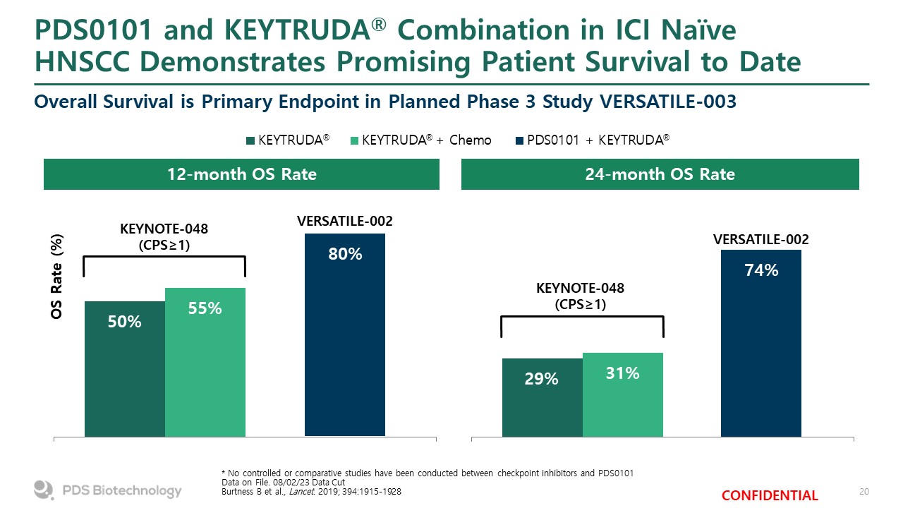 PDS0101 and KEYTRUDA® Combination in ICI NaïveHNSCC Demonstrates Promising Patient Survival to Date  Overall Survival is Primary Endpoint in Planned Phase 3 Study VERSATILE-003  * No controlled or comparative studies have been conducted between checkpoint inhibitors and PDS0101Data on File. 08/02/23 Data CutBurtness B et al., Lancet. 2019; 394:1915-1928  OS Rate (%)  VERSATILE-002  VERSATILE-002  ®  ®  ®  KEYNOTE-048(CPS≥1)  KEYNOTE-048(CPS≥1)  12-month OS Rate  24-month OS Rate