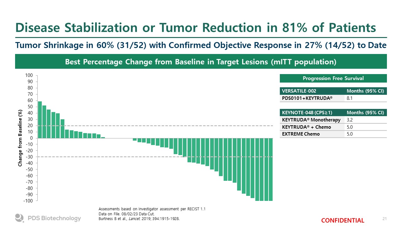Disease Stabilization or Tumor Reduction in 81% of Patients  Tumor Shrinkage in 60% (31/52) with Confirmed Objective Response in 27% (14/52) to Date  Assessments based on Investigator assessment per RECIST 1.1  Data on File. 08/02/23 Data Cut.  Burtness B et al., Lancet. 2019; 394:1915-1928.  Best Percentage Change from Baseline in Target Lesions (mITT population)  VERSATILE-002  Months (95% CI)  PDS0101+KEYTRUDA®  8.1  KEYNOTE-048 (CPS≥1)  Months (95% CI)  KEYTRUDA® Monotherapy  3.2  KEYTRUDA® + Chemo  5.0  EXTREME Chemo  5.0  Progression Free Survival