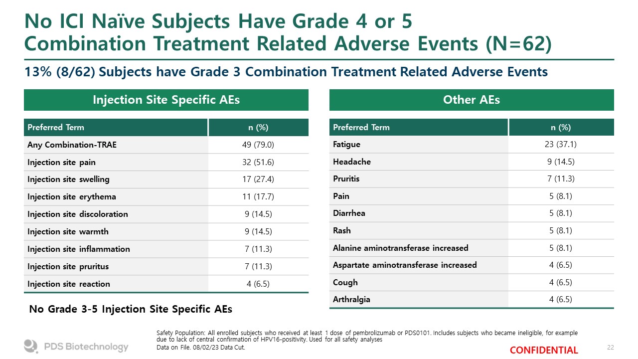 No ICI Naïve Subjects Have Grade 4 or 5 Combination Treatment Related Adverse Events (N=62)  Safety Population: All enrolled subjects who received at least 1 dose of pembrolizumab or PDS0101. Includes subjects who became ineligible, for example due to lack of central confirmation of HPV16-positivity. Used for all safety analyses  Data on File. 08/02/23 Data Cut.  Preferred Term  n (%)  Any Combination-TRAE  49 (79.0)  Injection site pain  32 (51.6)  Injection site swelling  17 (27.4)  Injection site erythema  11 (17.7)  Injection site discoloration  9 (14.5)  Injection site warmth  9 (14.5)  Injection site inflammation  7 (11.3)  Injection site pruritus  7 (11.3)  Injection site reaction  4 (6.5)  Preferred Term  n (%)  Fatigue  23 (37.1)  Headache  9 (14.5)  Pruritis  7 (11.3)  Pain  5 (8.1)  Diarrhea  5 (8.1)  Rash  5 (8.1)  Alanine aminotransferase increased  5 (8.1)  Aspartate aminotransferase increased  4 (6.5)  Cough  4 (6.5)  Arthralgia  4 (6.5)  13% (8/62) Subjects have Grade 3 Combination Treatment Related Adverse Events  No Grade 3-5 Injection Site Specific AEs  Injection Site Specific AEs   Other AEs