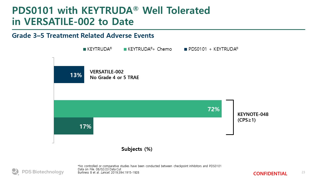 PDS0101 with KEYTRUDA® Well Tolerated in VERSATILE-002 to Date  Grade 3–5 Treatment Related Adverse Events  *No controlled or comparative studies have been conducted between checkpoint inhibitors and PDS0101  Data on File. 08/02/23 Data Cut  Burtness B et al. Lancet. 2019;394:1915-1928  ®  ®  ®  VERSATILE-002  No Grade 4 or 5 TRAE  Subjects (%)  KEYNOTE-048(CPS≥1)
