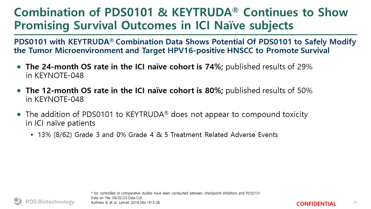 Combination of PDS0101 & KEYTRUDA® Continues to Show Promising Survival Outcomes in ICI Naïve subjects  PDS0101 with KEYTRUDA® Combination Data Shows Potential Of PDS0101 to Safely Modify the Tumor Microenvironment and Target HPV16-positive HNSCC to Promote Survival  The 24-month OS rate in the ICI naïve cohort is 74%; published results of 29% in KEYNOTE-048  The 12-month OS rate in the ICI naïve cohort is 80%; published results of 50% in KEYNOTE-048  The addition of PDS0101 to KEYTRUDA® does not appear to compound toxicity in ICI naïve patients   13% (8/62) Grade 3 and 0% Grade 4 & 5 Treatment Related Adverse Events  * No controlled or comparative studies have been conducted between checkpoint inhibitors and PDS0101  Data on File. 08/02/23 Data Cut.  Burtness B, et al. Lancet. 2019;394:1915-28.