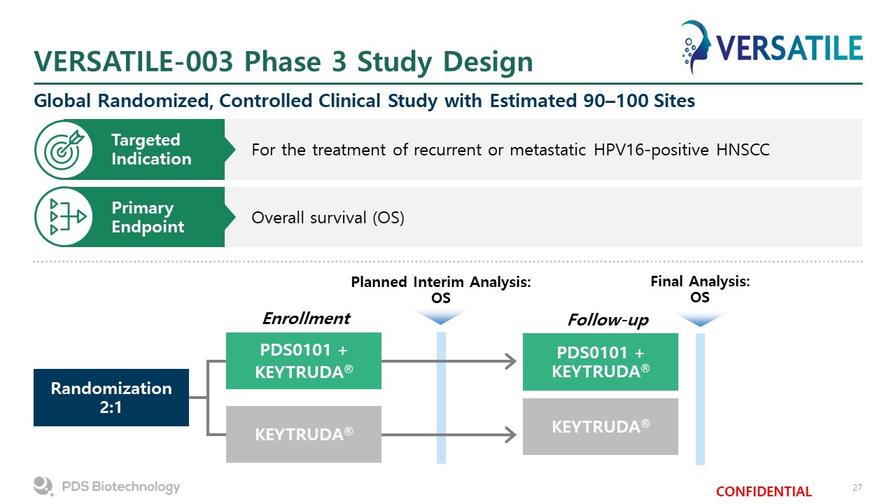 VERSATILE-003 Phase 3 Study Design  Global Randomized, Controlled Clinical Study with Estimated 90–100 Sites  Overall survival (OS)  Primary Endpoint  For the treatment of recurrent or metastatic HPV16-positive HNSCC  Targeted Indication  Randomization 2:1  PDS0101 +KEYTRUDA®   PDS0101 + KEYTRUDA®   KEYTRUDA®  KEYTRUDA®  Planned Interim Analysis: OS  Final Analysis:OS  Enrollment  Follow-up