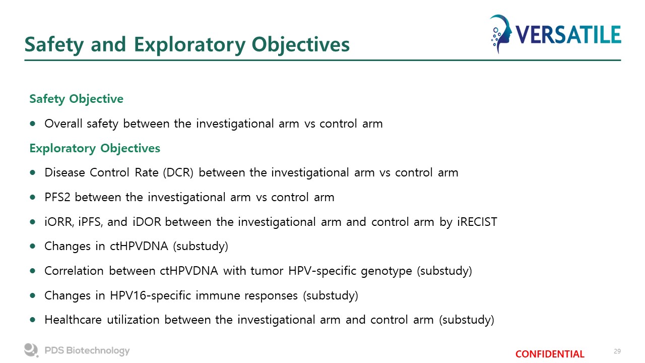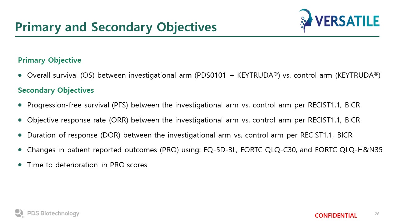 Primary and Secondary Objectives  Primary Objective  Overall survival (OS) between investigational arm (PDS0101 + KEYTRUDA®) vs. control arm (KEYTRUDA®)  Secondary Objectives  Progression-free survival (PFS) between the investigational arm vs. control arm per RECIST1.1, BICR   Objective response rate (ORR) between the investigational arm vs. control arm per RECIST1.1, BICR   Duration of response (DOR) between the investigational arm vs. control arm per RECIST1.1, BICR   Changes in patient reported outcomes (PRO) using: EQ-5D-3L, EORTC QLQ-C30, and EORTC QLQ-H&N35  Time to deterioration in PRO scores