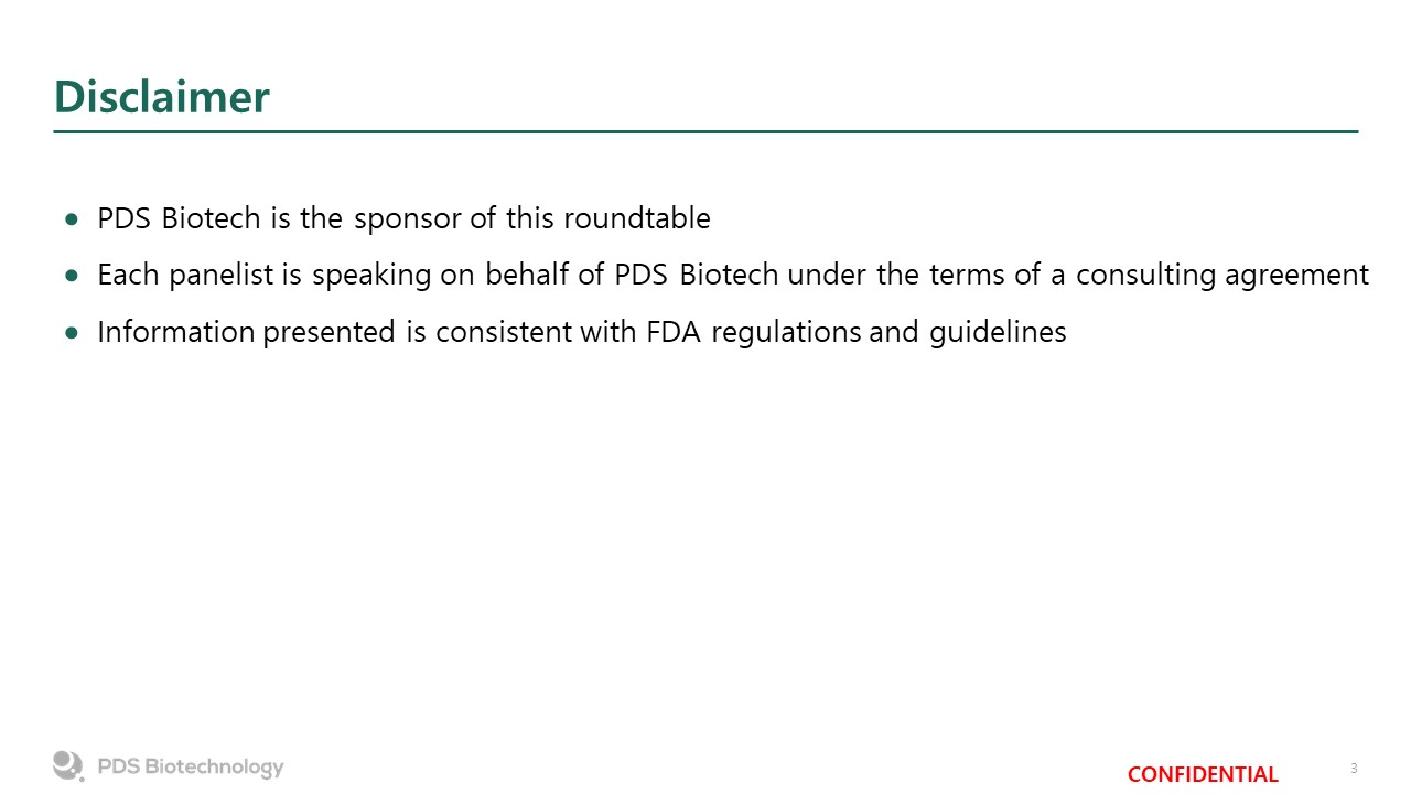 Disclaimer  PDS Biotech is the sponsor of this roundtable  Each panelist is speaking on behalf of PDS Biotech under the terms of a consulting agreement  Information presented is consistent with FDA regulations and guidelines