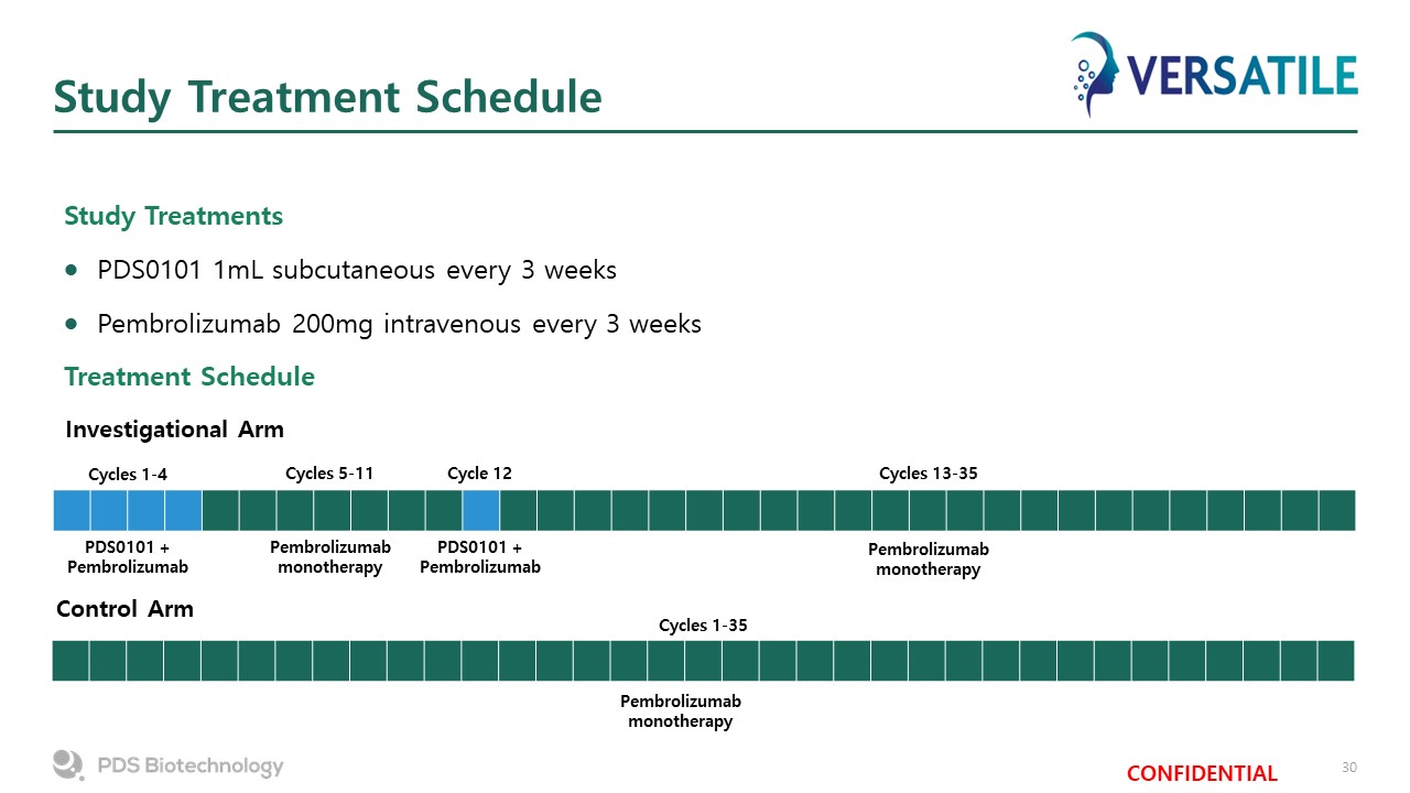 Study Treatment Schedule   Study Treatments  PDS0101 1mL subcutaneous every 3 weeks  Pembrolizumab 200mg intravenous every 3 weeks  Treatment Schedule  Cycles 1-4  Cycles 5-11  Cycles 13-35  Cycle 12  PDS0101 + Pembrolizumab  PDS0101 + Pembrolizumab  Pembrolizumab monotherapy  Pembrolizumab monotherapy  Cycles 1-35  Pembrolizumab monotherapy  Investigational Arm  Control Arm