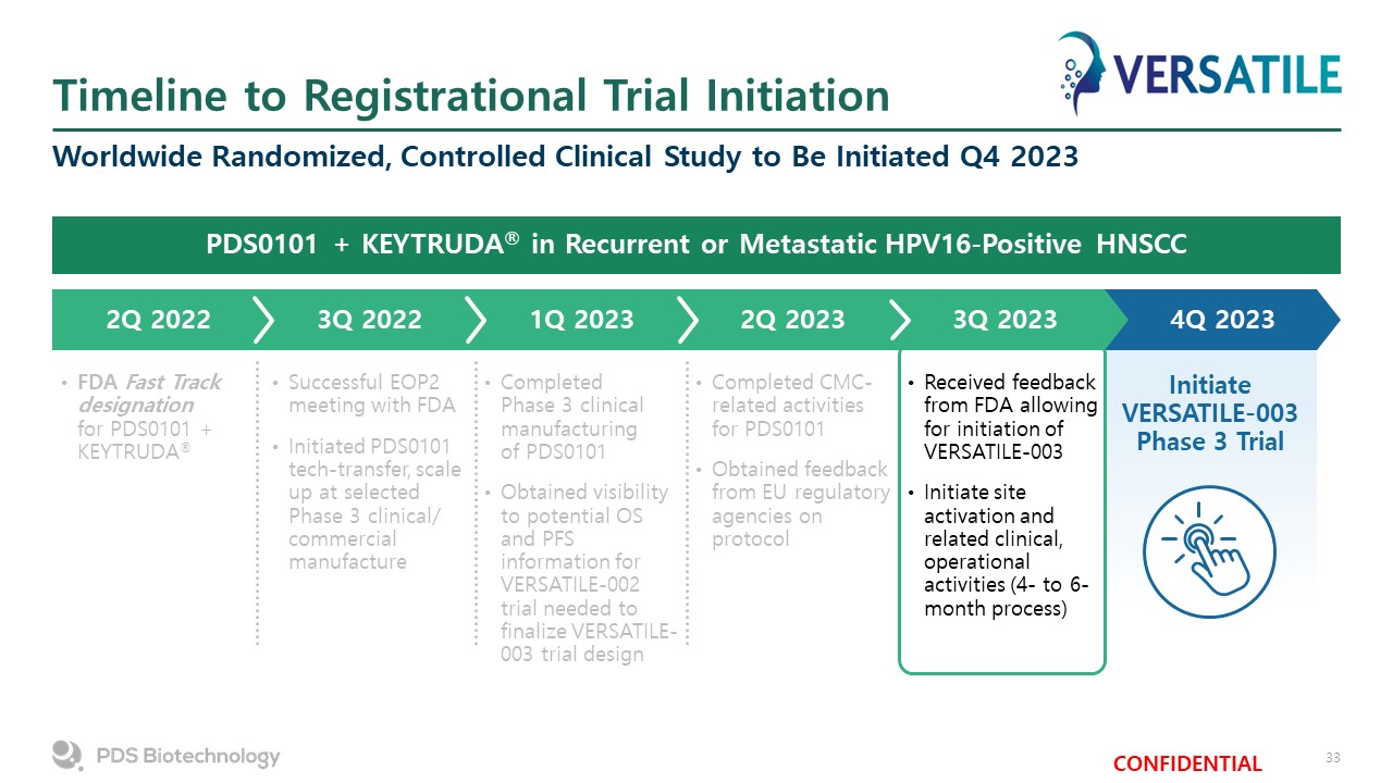 Timeline to Registrational Trial Initiation  Worldwide Randomized, Controlled Clinical Study to Be Initiated Q4 2023  PDS0101 + KEYTRUDA® in Recurrent or Metastatic HPV16-Positive HNSCC  2Q 2022  3Q 2022  1Q 2023  2Q 2023  3Q 2023  4Q 2023  FDA Fast Track designation for PDS0101 + KEYTRUDA®  Successful EOP2 meeting with FDA  Initiated PDS0101 tech-transfer, scale up at selected Phase 3 clinical/commercial manufacture  Completed Phase 3 clinical manufacturing of PDS0101  Obtained visibility to potential OS and PFS information for VERSATILE-002 trial needed to finalize VERSATILE-003 trial design  Completed CMC-related activities for PDS0101  Obtained feedback from EU regulatory agencies on protocol  Received feedback from FDA allowing for initiation of VERSATILE-003  Initiate site activation and related clinical, operational activities (4- to 6-month process)  InitiateVERSATILE-003 Phase 3 Trial
