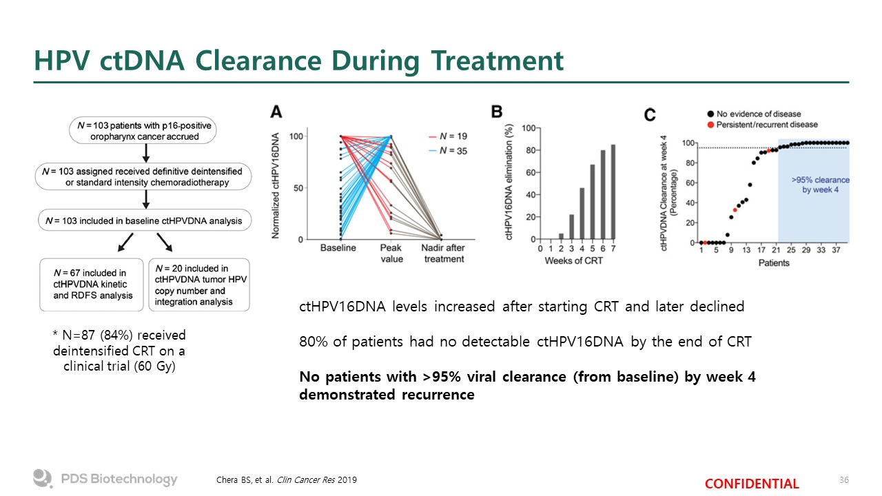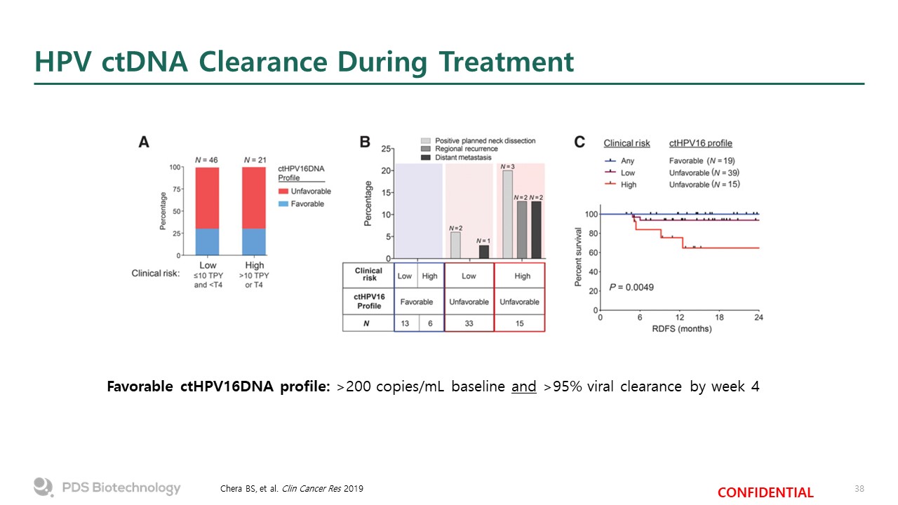 HPV ctDNA Clearance During Treatment  Chera BS, et al. Clin Cancer Res 2019  Favorable ctHPV16DNA profile: >200 copies/mL baseline and >95% viral clearance by week 4
