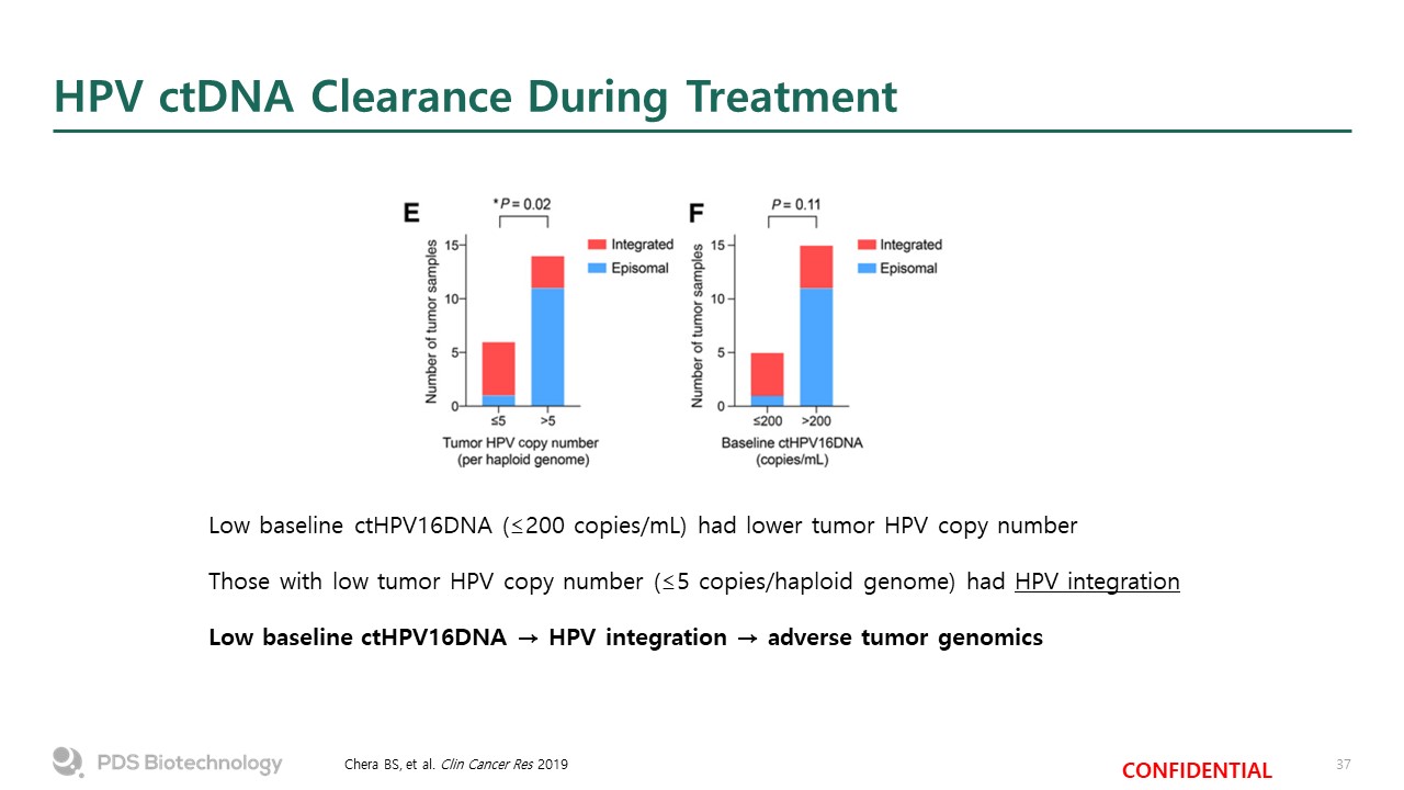 HPV ctDNA Clearance During Treatment  Chera BS, et al. Clin Cancer Res 2019  Low baseline ctHPV16DNA (≤200 copies/mL) had lower tumor HPV copy number  Those with low tumor HPV copy number (≤5 copies/haploid genome) had HPV integration  Low baseline ctHPV16DNA → HPV integration → adverse tumor genomics