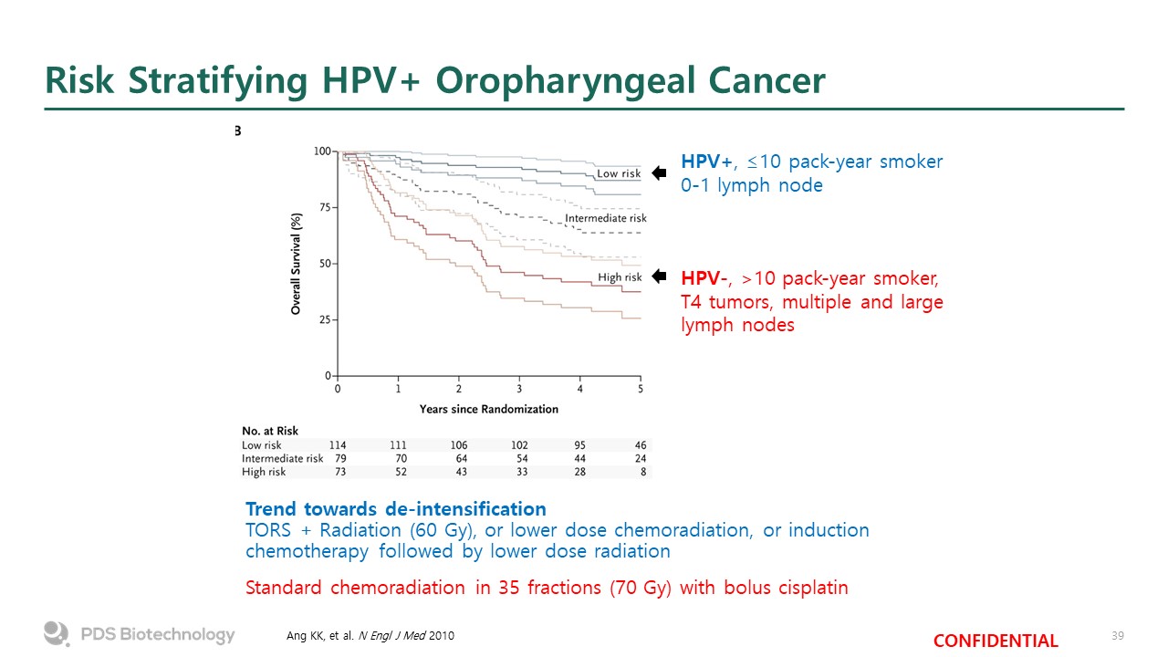 Risk Stratifying HPV+ Oropharyngeal Cancer  Ang KK, et al. N Engl J Med 2010  HPV+, ≤10 pack-year smoker  0-1 lymph node  Trend towards de-intensificationTORS + Radiation (60 Gy), or lower dose chemoradiation, or induction chemotherapy followed by lower dose radiation  Standard chemoradiation in 35 fractions (70 Gy) with bolus cisplatin  HPV-, >10 pack-year smoker, T4 tumors, multiple and large lymph nodes