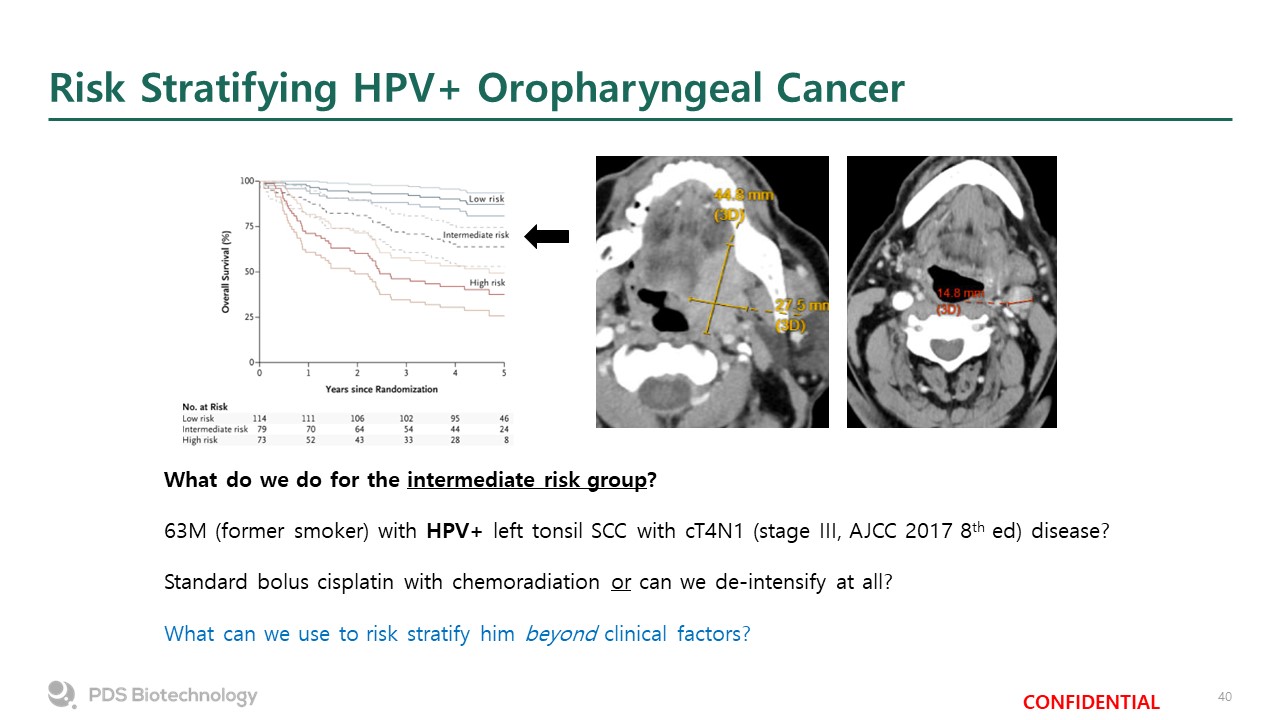 Risk Stratifying HPV+ Oropharyngeal Cancer  What do we do for the intermediate risk group?  63M (former smoker) with HPV+ left tonsil SCC with cT4N1 (stage III, AJCC 2017 8th ed) disease?  Standard bolus cisplatin with chemoradiation or can we de-intensify at all?  What can we use to risk stratify him beyond clinical factors?