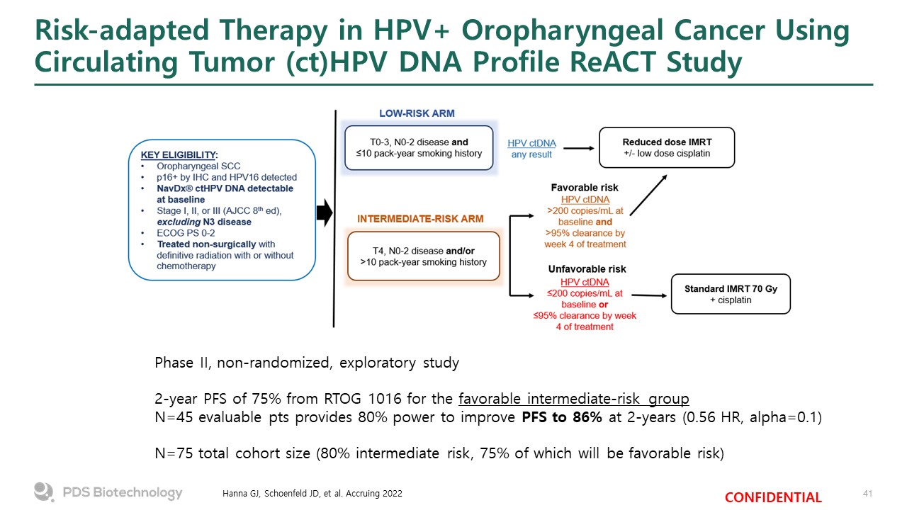 Risk-adapted Therapy in HPV+ Oropharyngeal Cancer Using Circulating Tumor (ct)HPV DNA Profile ReACT Study  Hanna GJ, Schoenfeld JD, et al. Accruing 2022  Phase II, non-randomized, exploratory study  2-year PFS of 75% from RTOG 1016 for the favorable intermediate-risk group  N=45 evaluable pts provides 80% power to improve PFS to 86% at 2-years (0.56 HR, alpha=0.1)  N=75 total cohort size (80% intermediate risk, 75% of which will be favorable risk)