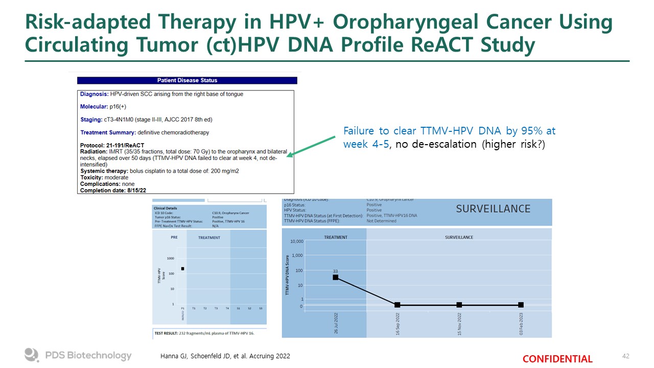 Risk-adapted Therapy in HPV+ Oropharyngeal Cancer Using Circulating Tumor (ct)HPV DNA Profile ReACT Study  Hanna GJ, Schoenfeld JD, et al. Accruing 2022  Failure to clear TTMV-HPV DNA by 95% at week 4-5, no de-escalation (higher risk?)