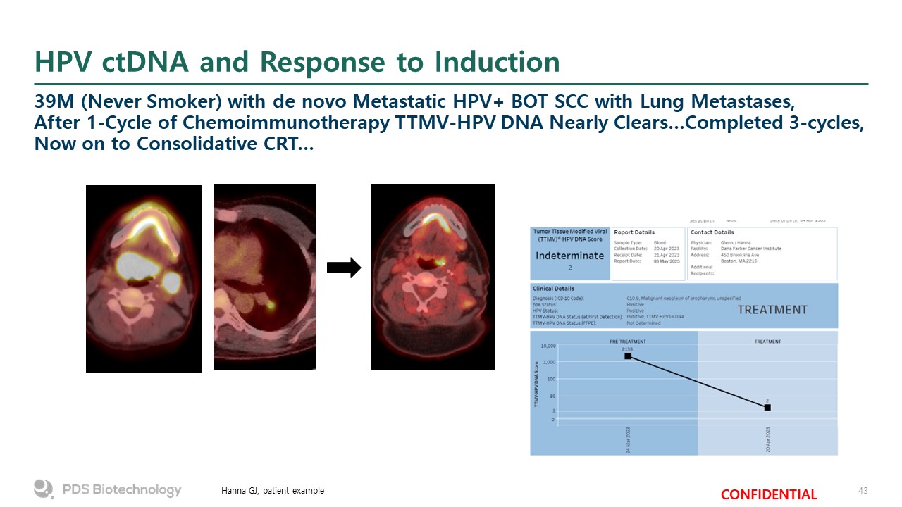 HPV ctDNA and Response to Induction  39M (Never Smoker) with de novo Metastatic HPV+ BOT SCC with Lung Metastases, After 1-Cycle of Chemoimmunotherapy TTMV-HPV DNA Nearly Clears…Completed 3-cycles, Now on to Consolidative CRT…  Hanna GJ, patient example