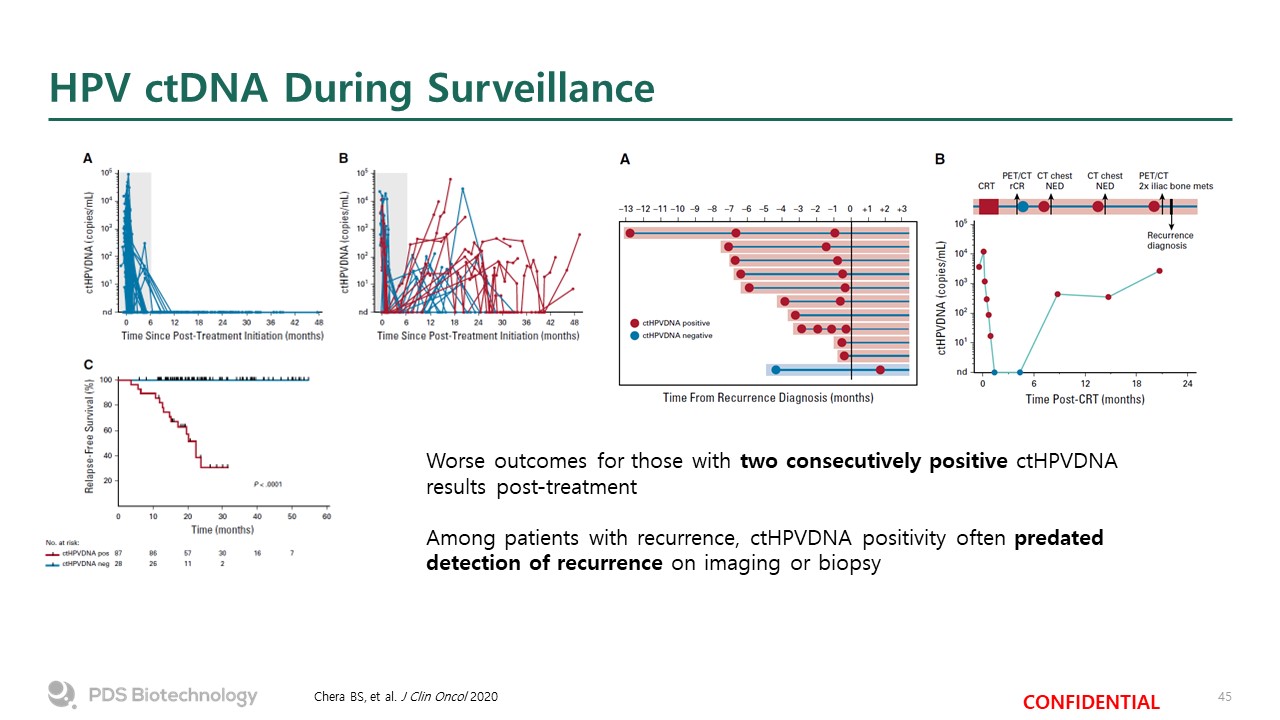 HPV ctDNA During Surveillance  Chera BS, et al. J Clin Oncol 2020  Worse outcomes for those with two consecutively positive ctHPVDNA results post-treatment  Among patients with recurrence, ctHPVDNA positivity often predated detection of recurrence on imaging or biopsy