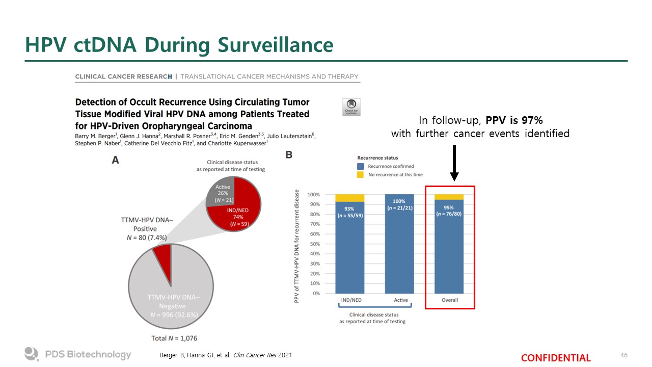 HPV ctDNA During Surveillance  Berger B, Hanna GJ, et al. Clin Cancer Res 2021  In follow-up, PPV is 97%   with further cancer events identified