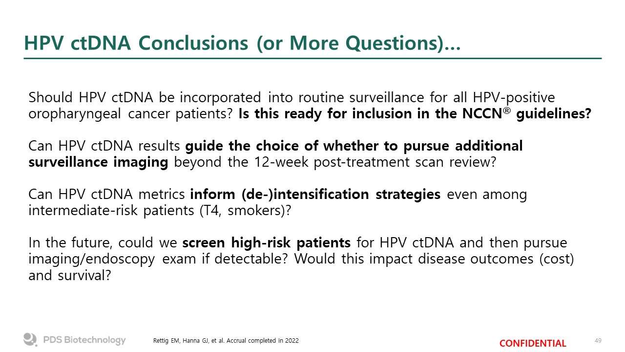 HPV ctDNA Conclusions (or More Questions)…  Rettig EM, Hanna GJ, et al. Accrual completed in 2022  Should HPV ctDNA be incorporated into routine surveillance for all HPV-positive oropharyngeal cancer patients? Is this ready for inclusion in the NCCN® guidelines?  Can HPV ctDNA results guide the choice of whether to pursue additional surveillance imaging beyond the 12-week post-treatment scan review?  Can HPV ctDNA metrics inform (de-)intensification strategies even among intermediate-risk patients (T4, smokers)?  In the future, could we screen high-risk patients for HPV ctDNA and then pursue imaging/endoscopy exam if detectable? Would this impact disease outcomes (cost) and survival?