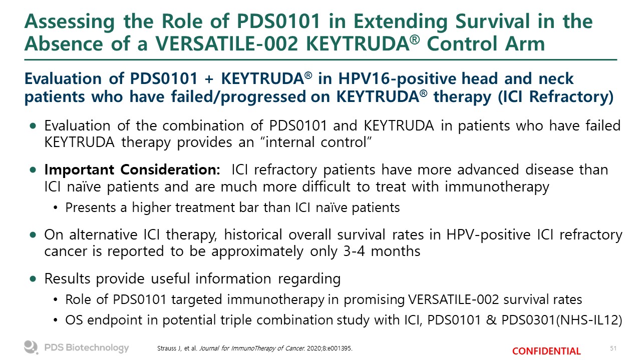 Assessing the Role of PDS0101 in Extending Survival in the Absence of a VERSATILE-002 KEYTRUDA® Control Arm  Strauss J, et al. Journal for ImmunoTherapy of Cancer. 2020;8:e001395.  Evaluation of the combination of PDS0101 and KEYTRUDA in patients who have failed KEYTRUDA therapy provides an “internal control”   Important Consideration: ICI refractory patients have more advanced disease than ICI naïve patients and are much more difficult to treat with immunotherapy  Presents a higher treatment bar than ICI naïve patients  On alternative ICI therapy, historical overall survival rates in HPV-positive ICI refractory cancer is reported to be approximately only 3-4 months  Results provide useful information regarding  Role of PDS0101 targeted immunotherapy in promising VERSATILE-002 survival rates   OS endpoint in potential triple combination study with ICI, PDS0101 & PDS0301(NHS-IL12)   Evaluation of PDS0101 + KEYTRUDA® in HPV16-positive head and neck patients who have failed/progressed on KEYTRUDA® therapy (ICI Refractory)