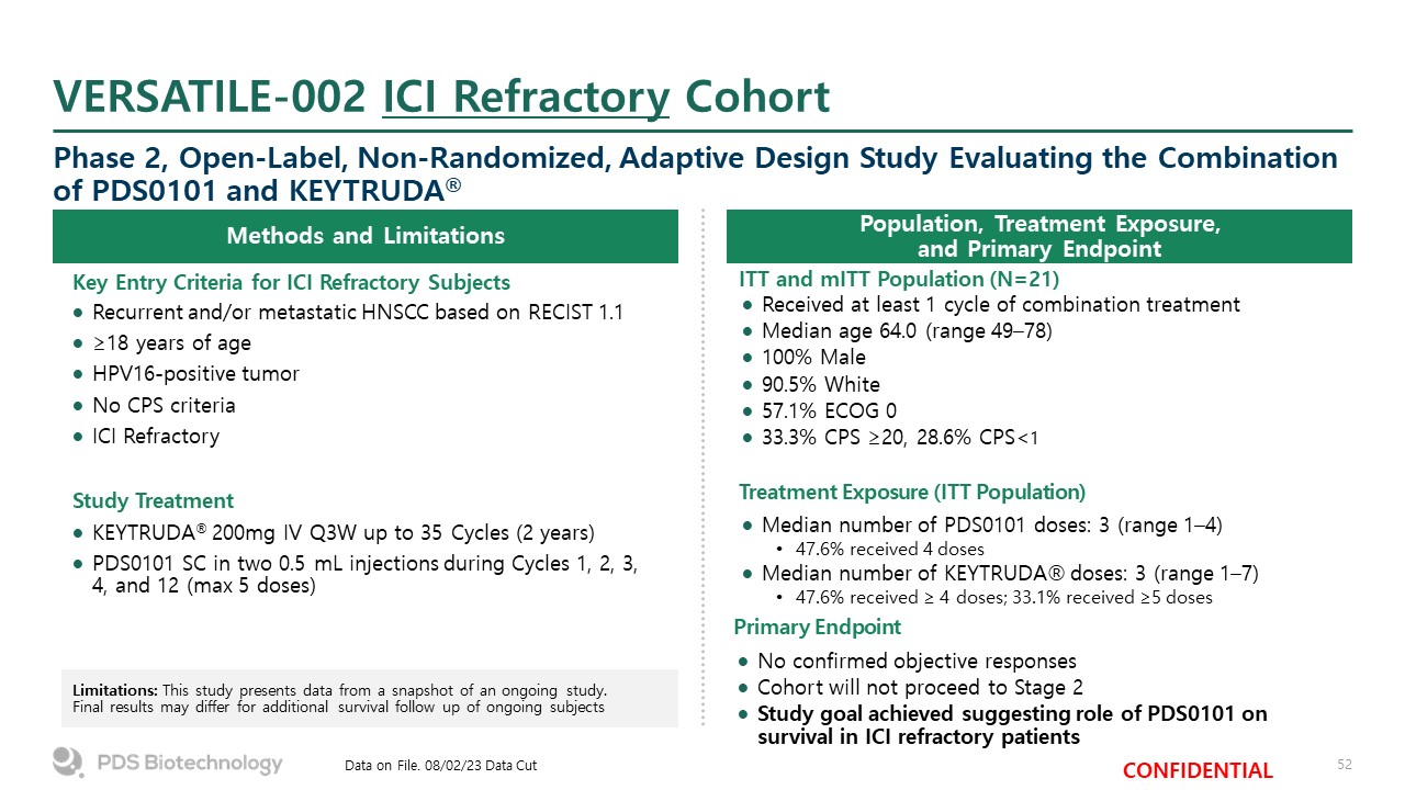 Methods and Limitations  VERSATILE-002 ICI Refractory Cohort  Phase 2, Open-Label, Non-Randomized, Adaptive Design Study Evaluating the Combination of PDS0101 and KEYTRUDA®  Data on File. 08/02/23 Data Cut  Population, Treatment Exposure, and Primary Endpoint  Limitations: This study presents data from a snapshot of an ongoing study. Final results may differ for additional survival follow up of ongoing subjects  Recurrent and/or metastatic HNSCC based on RECIST 1.1  ≥18 years of age  HPV16-positive tumor  No CPS criteria  ICI Refractory  Study Treatment  KEYTRUDA® 200mg IV Q3W up to 35 Cycles (2 years)  PDS0101 SC in two 0.5 mL injections during Cycles 1, 2, 3, 4, and 12 (max 5 doses)  Key Entry Criteria for ICI Refractory Subjects  ITT and mITT Population (N=21)  Received at least 1 cycle of combination treatment  Median age 64.0 (range 49–78)  100% Male  90.5% White  57.1% ECOG 0  33.3% CPS ≥20, 28.6% CPS<1  Treatment Exposure (ITT Population)  Median number of PDS0101 doses: 3 (range 1–4)  47.6% received 4 doses  Median number of KEYTRUDA® doses: 3 (range 1–7)  47.6% received ≥ 4 doses; 33.1% received ≥5 doses  Primary Endpoint  No confirmed objective responses  Cohort will not proceed to Stage 2  Study goal achieved suggesting role of PDS0101 on survival in ICI refractory patients