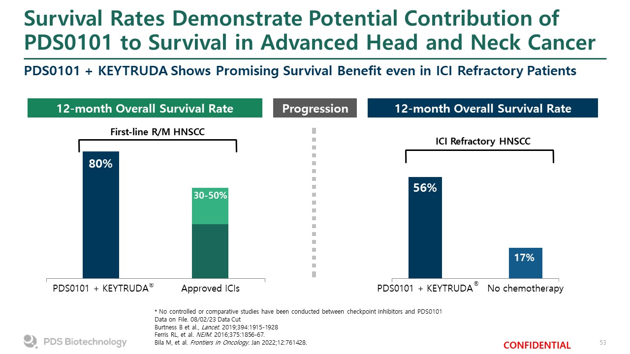 Survival Rates Demonstrate Potential Contribution of PDS0101 to Survival in Advanced Head and Neck Cancer  PDS0101 + KEYTRUDA Shows Promising Survival Benefit even in ICI Refractory Patients  * No controlled or comparative studies have been conducted between checkpoint inhibitors and PDS0101  Data on File. 08/02/23 Data Cut  Burtness B et al., Lancet. 2019;394:1915-1928  Ferris RL, et al. NEJM. 2016;375:1856-67.  Bila M, et al. Frontiers in Oncology. Jan 2022;12:761428.  12-month Overall Survival Rate  ®  First-line R/M HNSCC  ICI Refractory HNSCC  12-month Overall Survival Rate  Progression  ®