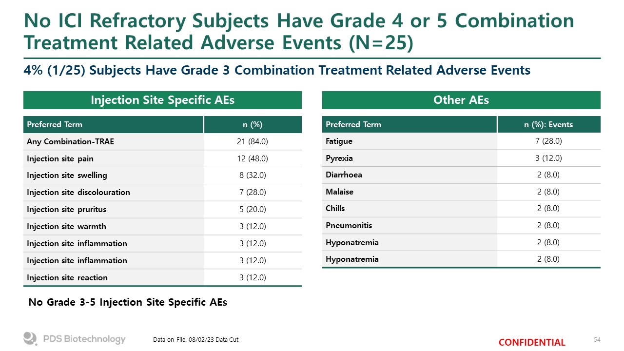 No ICI Refractory Subjects Have Grade 4 or 5 Combination Treatment Related Adverse Events (N=25)   4% (1/25) Subjects Have Grade 3 Combination Treatment Related Adverse Events  Data on File. 08/02/23 Data Cut  Preferred Term  n (%)  Any Combination-TRAE  21 (84.0)  Injection site pain  12 (48.0)  Injection site swelling  8 (32.0)  Injection site discolouration  7 (28.0)  Injection site pruritus  5 (20.0)  Injection site warmth  3 (12.0)  Injection site inflammation  3 (12.0)  Injection site inflammation  3 (12.0)  Injection site reaction  3 (12.0)  Preferred Term  n (%): Events  Fatigue  7 (28.0)  Pyrexia  3 (12.0)  Diarrhoea  2 (8.0)  Malaise  2 (8.0)  Chills  2 (8.0)  Pneumonitis  2 (8.0)  Hyponatremia  2 (8.0)  Hyponatremia  2 (8.0)  No Grade 3-5 Injection Site Specific AEs  Injection Site Specific AEs   Other AEs