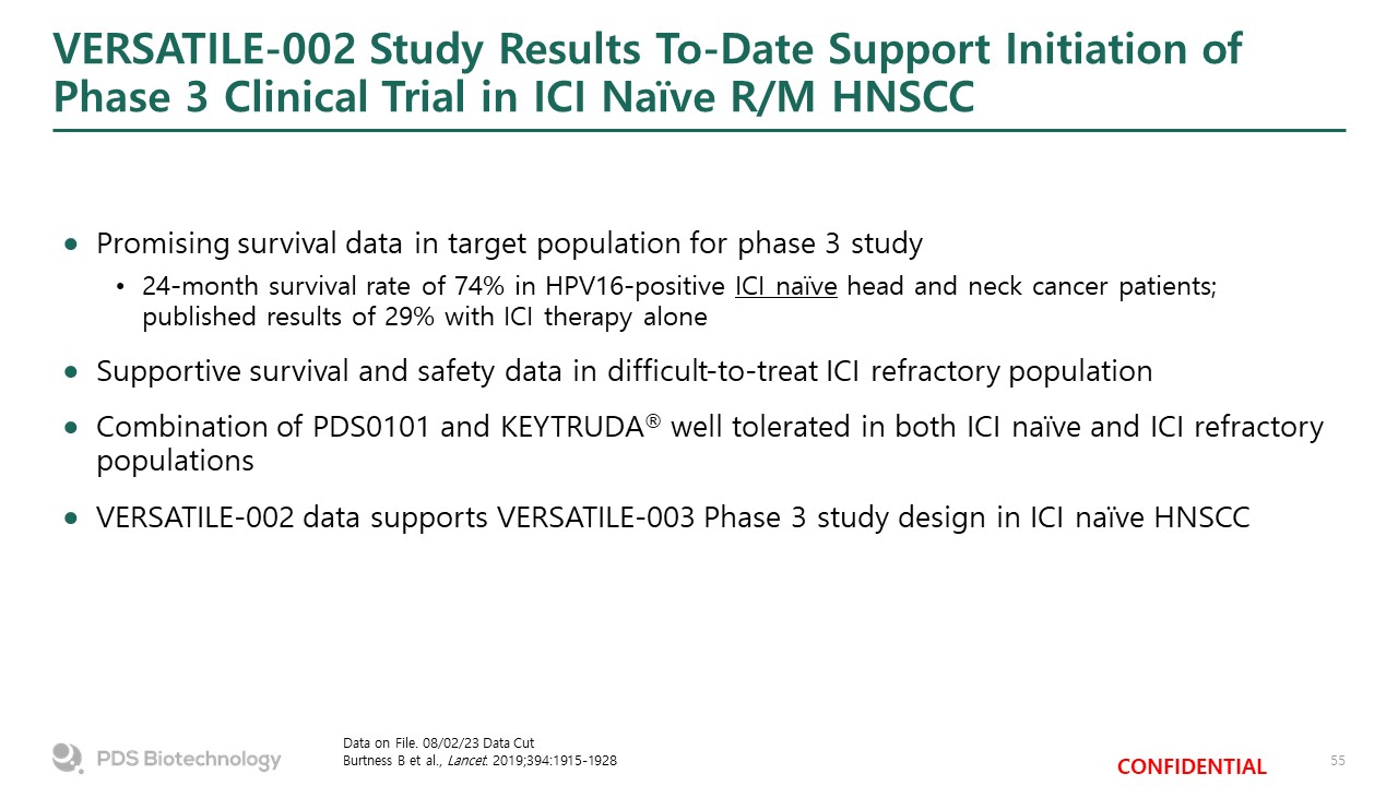 VERSATILE-002 Study Results To-Date Support Initiation of Phase 3 Clinical Trial in ICI Naïve R/M HNSCC  Data on File. 08/02/23 Data Cut  Burtness B et al., Lancet. 2019;394:1915-1928  Promising survival data in target population for phase 3 study  24-month survival rate of 74% in HPV16-positive ICI naïve head and neck cancer patients; published results of 29% with ICI therapy alone  Supportive survival and safety data in difficult-to-treat ICI refractory population  Combination of PDS0101 and KEYTRUDA® well tolerated in both ICI naïve and ICI refractory populations  VERSATILE-002 data supports VERSATILE-003 Phase 3 study design in ICI naïve HNSCC