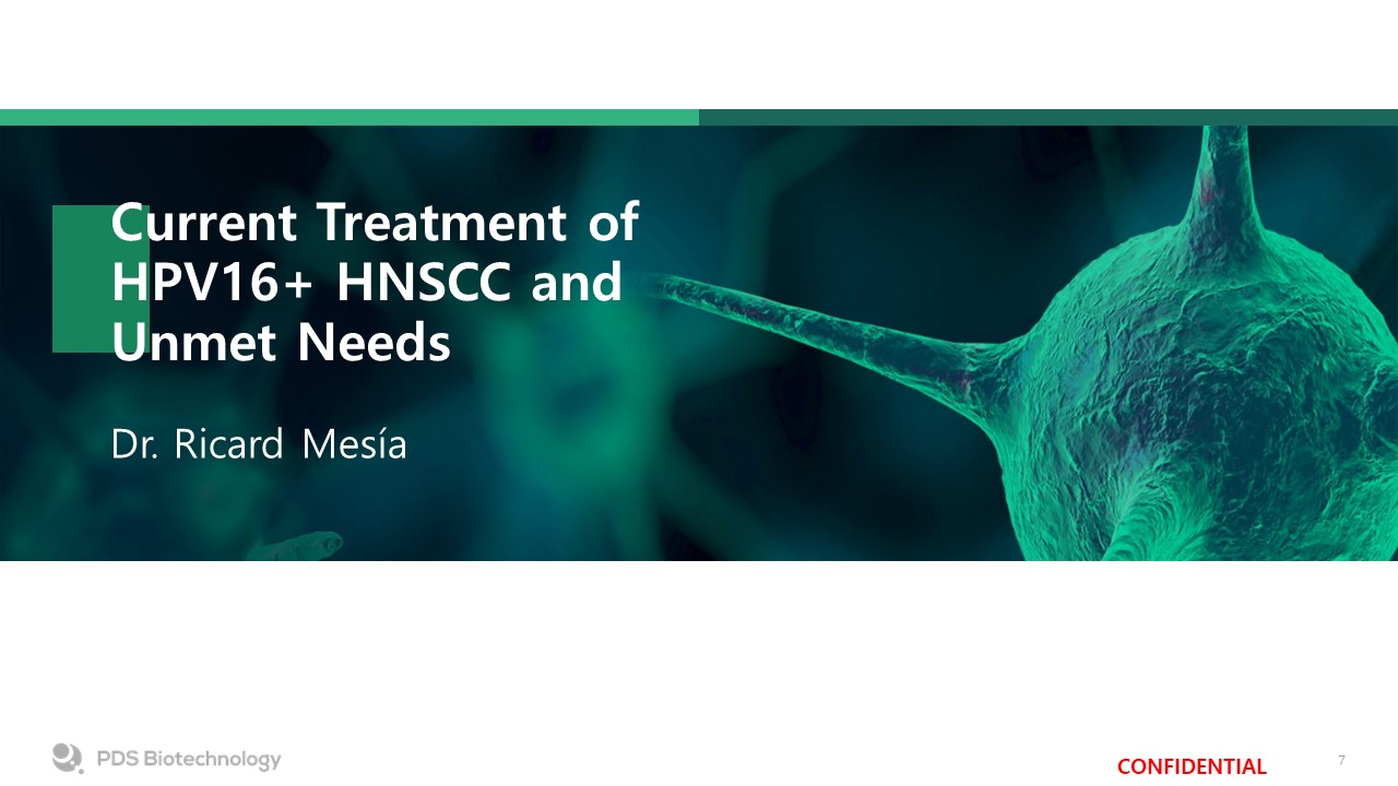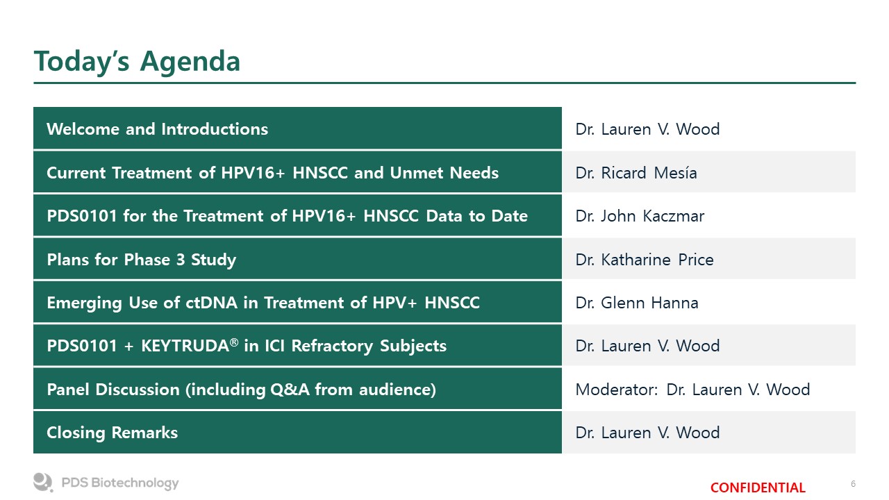 Today’s Agenda  Welcome and Introductions  Dr. Lauren V. Wood  Current Treatment of HPV16+ HNSCC and Unmet Needs  Dr. Ricard Mesía   PDS0101 for the Treatment of HPV16+ HNSCC Data to Date  Dr. John Kaczmar  Plans for Phase 3 Study  Dr. Katharine Price  Emerging Use of ctDNA in Treatment of HPV+ HNSCC  Dr. Glenn Hanna  PDS0101 + KEYTRUDA® in ICI Refractory Subjects  Dr. Lauren V. Wood  Panel Discussion (including Q&A from audience)  Moderator: Dr. Lauren V. Wood  Closing Remarks  Dr. Lauren V. Wood