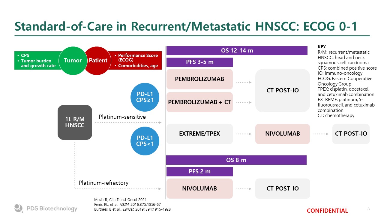 CPS  Tumor burden and growth rate  Standard-of-Care in Recurrent/Metastatic HNSCC: ECOG 0-1   Mesia R, Clin Transl Oncol 2021  Ferris RL, et al. NEJM. 2016;375:1856-67  Burtness B et al., Lancet. 2019; 394:1915-1928  OS 12-14 m  PFS 3-5 m  CT POST-IO  OS 8 m  PFS 2 m  PD-L1  CPS≥1  PD-L1  CPS<1  Performance Score (ECOG)  Comorbidities, age  Patient  Tumor  Platinum-sensitive  Platinum-refractory  PEMBROLIZUMAB  PEMBROLIZUMAB + CT  EXTREME/TPEX  NIVOLUMAB  CT POST-IO  NIVOLUMAB  CT POST-IO  1L R/M  HNSCC  KEY  R/M: recurrent/metastatic  HNSCC: head and neck squamous cell carcinoma  CPS: combined positive score  IO: immuno-oncology  ECOG: Eastern Cooperative Oncology Group  TPEX: cisplatin, docetaxel, and cetuximab combination  EXTREME: platinum, 5-fluorousracil, and cetuximab combination  CT: chemotherapy