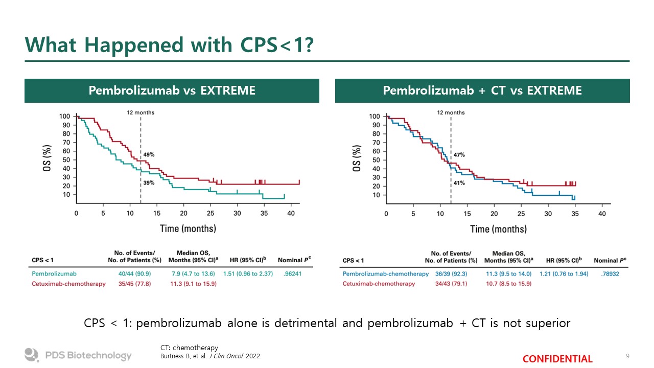 What Happened with CPS<1?  CT: chemotherapy  Burtness B, et al. J Clin Oncol. 2022.  Pembrolizumab vs EXTREME  Pembrolizumab + CT vs EXTREME  CPS < 1: pembrolizumab alone is detrimental and pembrolizumab + CT is not superior