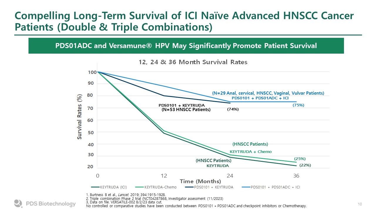 Compelling Long-Term Survival of ICI Naïve Advanced HNSCC Cancer Patients (Double & Triple Combinations)  PDS01ADC and Versamune® HPV May Significantly Promote Patient Survival  (N=53 HNSCC Patients)  (HNSCC Patients)  (HNSCC Patients)  (N=29 Anal, cervical, HNSCC, Vaginal, Vulvar Patients)  1. Burtness B et al., Lancet. 2019; 394:1915-1928.  2. Triple combination Phase 2 trial (NCT04287868, Investigator assessment (11/2023)  3, Data on file. VERSATILE-002 8/2/23 data cut.  No controlled or comparative studies have been conducted between PDS0101 + PDS01ADC and checkpoint inhibitors or Chemotherapy.