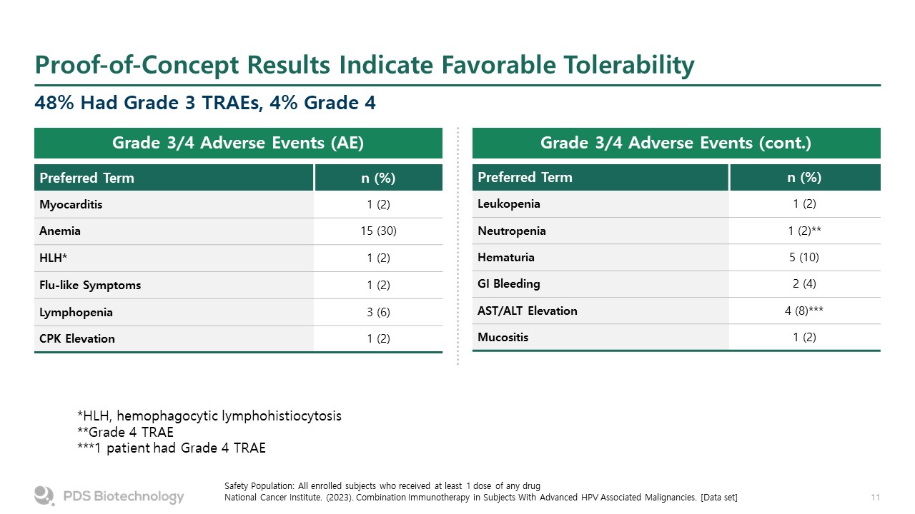 Proof-of-Concept Results Indicate Favorable Tolerability  48% Had Grade 3 TRAEs, 4% Grade 4  Safety Population: All enrolled subjects who received at least 1 dose of any drug  National Cancer Institute. (2023). Combination Immunotherapy in Subjects With Advanced HPV Associated Malignancies. [Data set]  Preferred Term  n (%)  Myocarditis  1 (2)  Anemia  15 (30)   HLH*  1 (2)  Flu-like Symptoms  1 (2)  Lymphopenia  3 (6)  CPK Elevation  1 (2)  Preferred Term  n (%)  Leukopenia  1 (2)  Neutropenia  1 (2)**  Hematuria  5 (10)  GI Bleeding  2 (4)  AST/ALT Elevation  4 (8)***  Mucositis  1 (2)  Grade 3/4 Adverse Events (AE)   Grade 3/4 Adverse Events (cont.)   *HLH, hemophagocytic lymphohistiocytosis  **Grade 4 TRAE  ***1 patient had Grade 4 TRAE