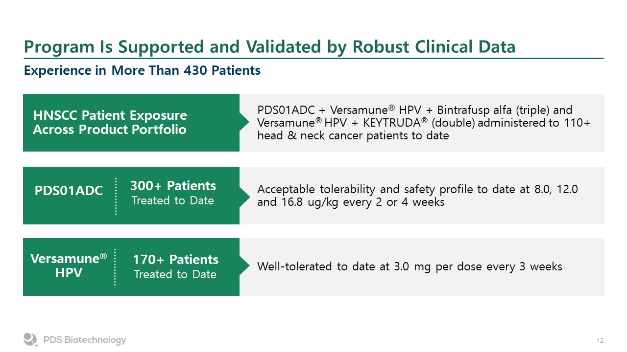 Program Is Supported and Validated by Robust Clinical Data  Experience in More Than 430 Patients   PDS01ADC + Versamune® HPV + Bintrafusp alfa (triple) and Versamune® HPV + KEYTRUDA® (double) administered to 110+ head & neck cancer patients to date  HNSCC Patient Exposure Across Product Portfolio  Well-tolerated to date at 3.0 mg per dose every 3 weeks  170+ Patients  Treated to Date  Versamune® HPV  Acceptable tolerability and safety profile to date at 8.0, 12.0 and 16.8 ug/kg every 2 or 4 weeks  300+ Patients  Treated to Date  PDS01ADC