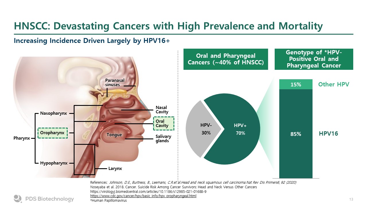 HNSCC: Devastating Cancers with High Prevalence and Mortality  References: Johnson, D.E., Burtness, B., Leemans, C.R.et al.Head and neck squamous cell carcinoma.Nat Rev Dis Primers6, 92 (2020)  Noseyaba et al. 2018. Cancer. Suicide Risk Among Cancer Survivors: Head and Neck Versus Other Cancers  https://virologyj.biomedcentral.com/articles/10.1186/s12985-021-01688-9  https://www.cdc.gov/cancer/hpv/basic_info/hpv_oropharyngeal.html  *Human Papillomavirus  Oral and PharyngealCancers (~40% of HNSCC)  Genotype of *HPV-Positive Oral and Pharyngeal Cancer  Paranasalsinuses  Nasopharynx  Oropharynx  Hypopharynx  Larynx  Pharynx  Tongue  Salivaryglands  OralCavity  NasalCavity  Increasing Incidence Driven Largely by HPV16+