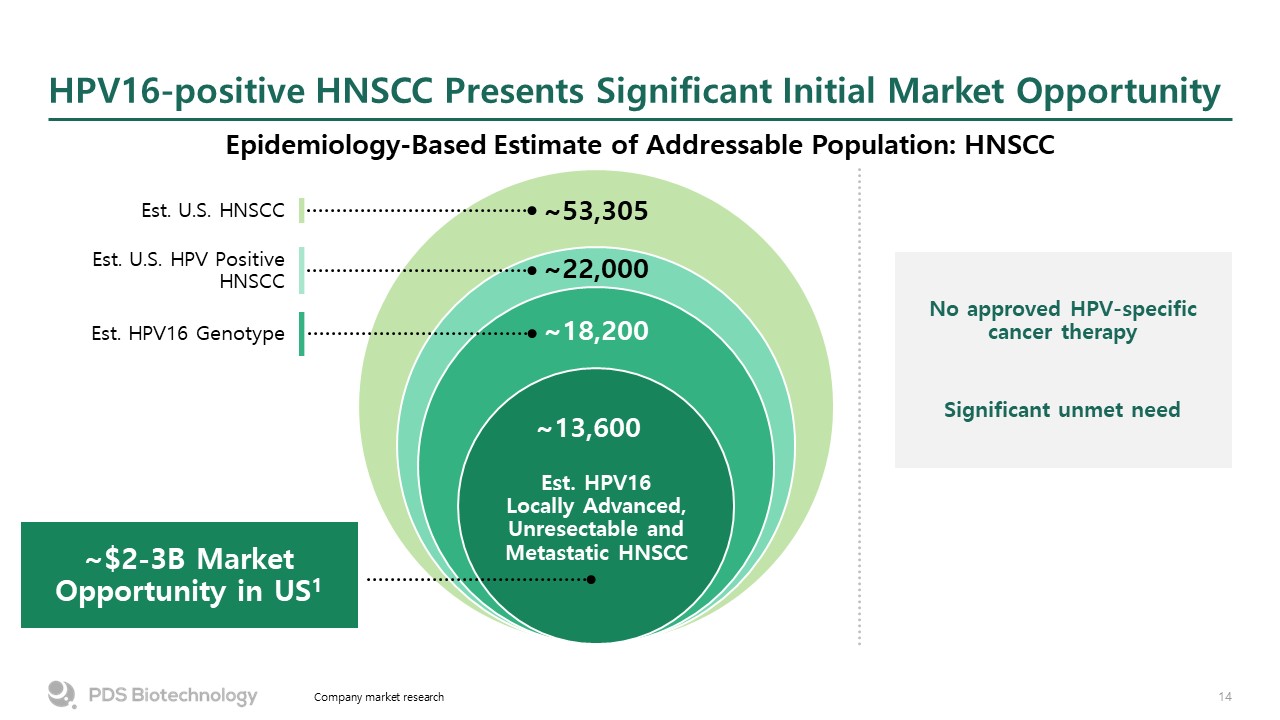 Est. HPV16Locally Advanced,Unresectable andMetastatic HNSCC  HPV16-positive HNSCC Presents Significant Initial Market Opportunity  Epidemiology-Based Estimate of Addressable Population: HNSCC  Company market research  ~13,600  ~18,200  ~22,000  ~53,305  Est. U.S. HPV Positive HNSCC  Est. U.S. HNSCC  Est. HPV16 Genotype  ~$2-3B Market Opportunity in US1  No approved HPV-specific cancer therapy  Significant unmet need