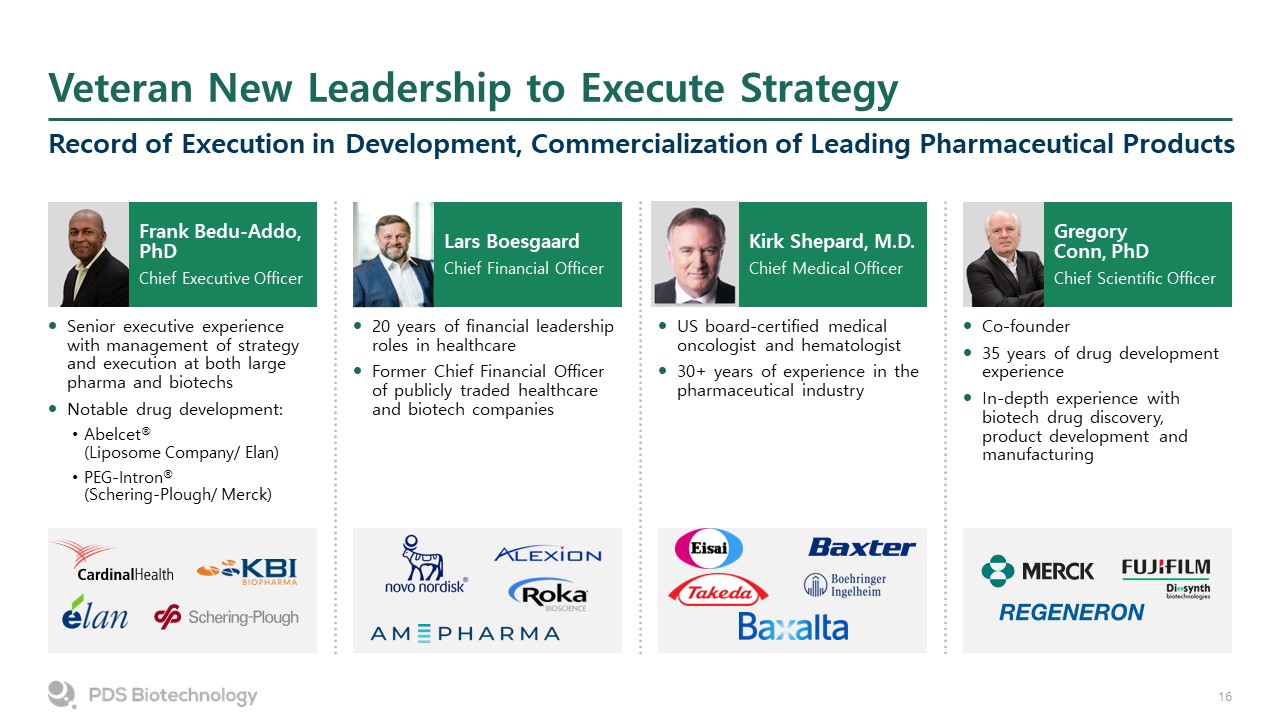Veteran New Leadership to Execute Strategy  Record of Execution in Development, Commercialization of Leading Pharmaceutical Products  Frank Bedu-Addo, PhD  Chief Executive Officer  Senior executive experience with management of strategy and execution at both large pharma and biotechs  Notable drug development:  Abelcet® (Liposome Company/ Elan)  PEG-Intron® (Schering-Plough/ Merck)  Lars Boesgaard  Chief Financial Officer  20 years of financial leadership roles in healthcare  Former Chief Financial Officer of publicly traded healthcare and biotech companies  Kirk Shepard, M.D.  Chief Medical Officer  US board-certified medical oncologist and hematologist  30+ years of experience in the pharmaceutical industry   Gregory Conn, PhD  Chief Scientific Officer  Co-founder  35 years of drug development experience   In-depth experience with biotech drug discovery, product development and manufacturing