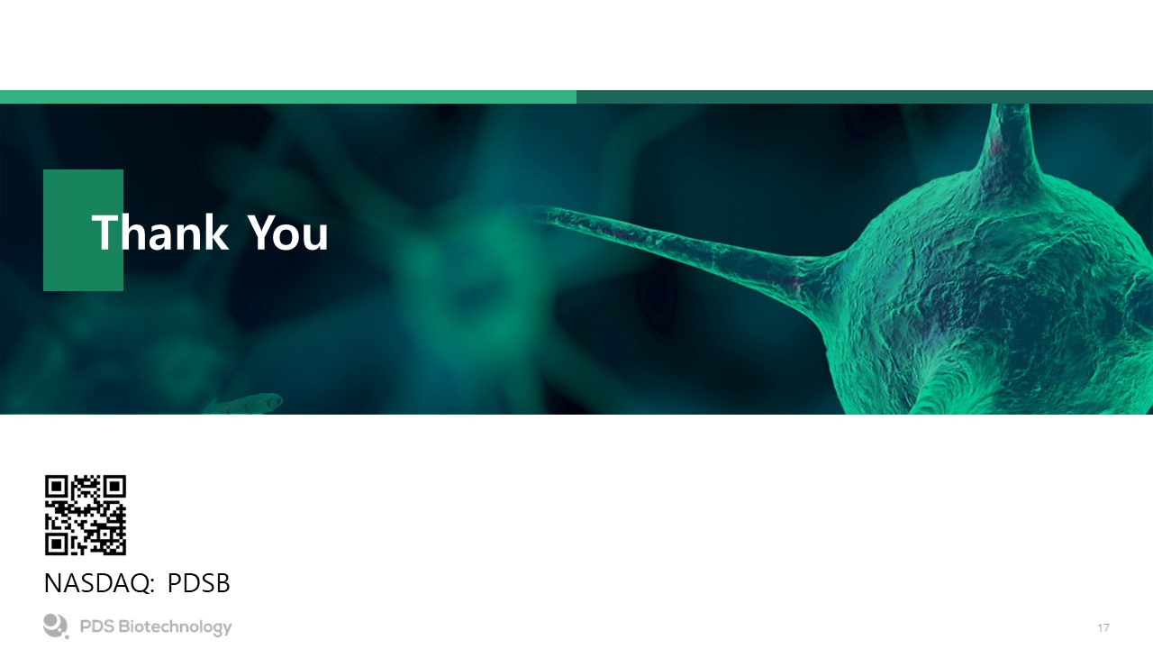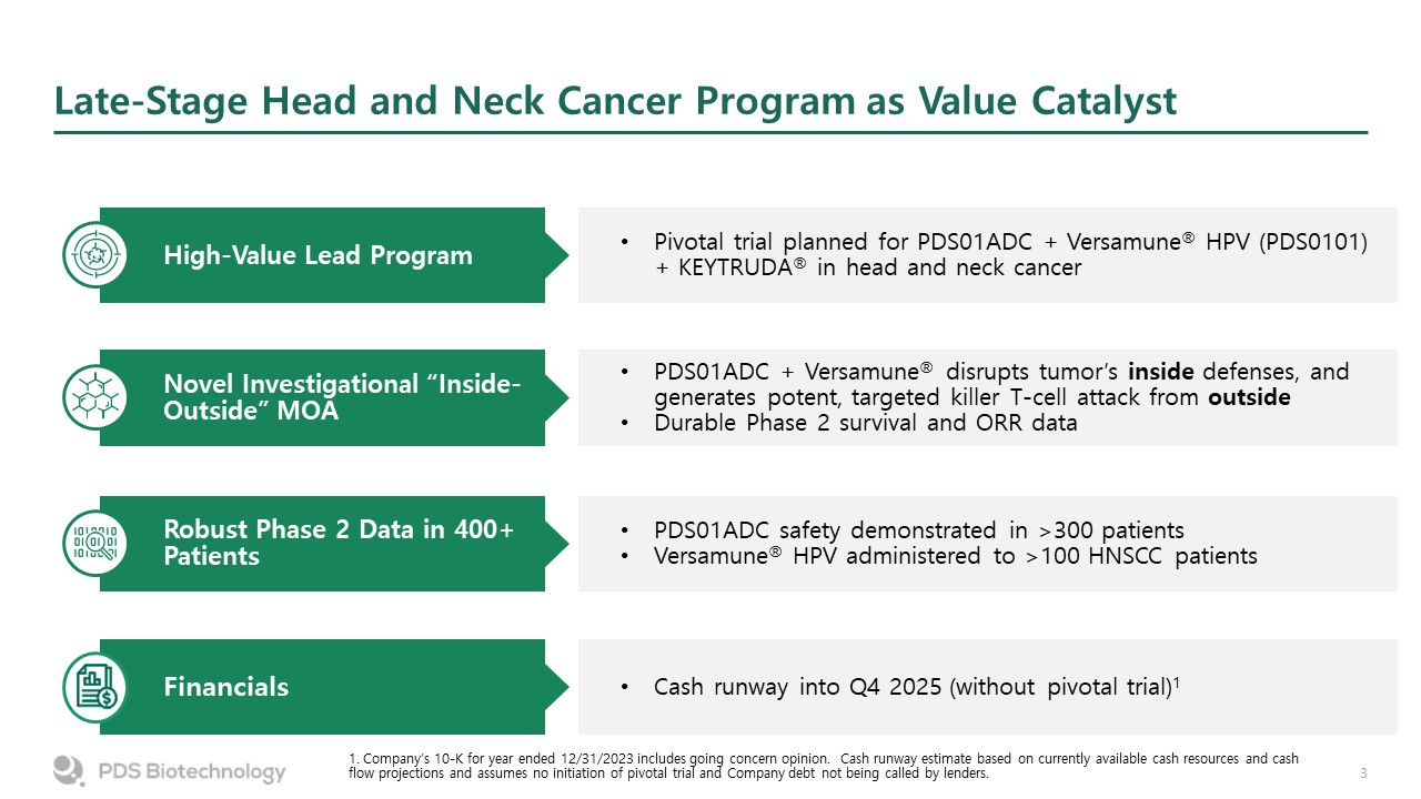 Late-Stage Head and Neck Cancer Program as Value Catalyst  Pivotal trial planned for PDS01ADC + Versamune® HPV (PDS0101) + KEYTRUDA® in head and neck cancer  High-Value Lead Program  PDS01ADC + Versamune® disrupts tumor’s inside defenses, and generates potent, targeted killer T-cell attack from outside   Durable Phase 2 survival and ORR data  Novel Investigational “Inside-Outside” MOA   PDS01ADC safety demonstrated in >300 patients  Versamune® HPV administered to >100 HNSCC patients  Robust Phase 2 Data in 400+ Patients   Cash runway into Q4 2025 (without pivotal trial)1  Financials  1. Company’s 10-K for year ended 12/31/2023 includes going concern opinion. Cash runway estimate based on currently available cash resources and cash flow projections and assumes no initiation of pivotal trial and Company debt not being called by lenders.