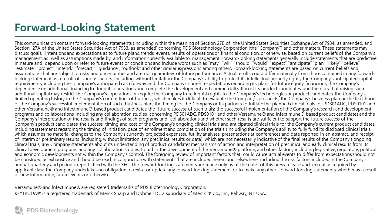 Forward-Looking Statement  This communication contains forward-looking statements (including within the meaning of Section 27E of the United States Securities Exchange Act of 7934, as amended, and Section 27A of the United States Securities Act of 7933, as amended) concerning PDS Biotechnology Corporation (the "Company") and other matters. These statements may discuss goals, intentions and expectations as to future plans, trends, events, results of operations or financial condition, or otherwise, based on current beliefs of the Company's management, as well as assumptions made by, and information currently available to, management. Forward-looking statements generally include statements that are predictive in nature and depend upon or refer to future events or conditions and include words such as "may" "will" "should" "would" "expect" "anticipate" "plan" "likely" "believe" "estimate" "project“ "intend," "forecast," "guidance", "outlook" and other similar expressions among others. Forward-looking statements are based on current beliefs and assumptions that are subject to risks and uncertainties and are not guarantees of future performance. Actual results could differ materially from those contained in any forward-looking statement as a result of various factors, including, without limitation: the Company's ability to protect its intellectual property rights; the Company's anticipated capital requirements, including the Company's anticipated cash runway and the Company's current expectations regarding its plans for future equity financings; the Company's dependence on additional financing to fund its operations and complete the development and commercialization of its product candidates, and the risks that raising such additional capital may restrict the Company's operations or require the Company to relinquish rights to the Company's technologies or product candidates; the Company's limited operating history in the Company's current line of business, which makes it difficult to evaluate the Company's prospects, the Company's business plan or the likelihood of the Company's successful implementation of such business plan; the timing for the Company or its partners to initiate the planned clinical trials for PDS01ADC, PDS0101 and other Versamune® and lnfectimune® based product candidates; the future success of such trials; the successful implementation of the Company's research and development programs and collaborations, including any collaboration studies concerning PDS01ADC, PDS0101 and other Versamune® and lnfectimune® based product candidates and the Company's interpretation of the results and findings of such programs and collaborations and whether such results are sufficient to support the future success of the Company's product candidates; the success, timing and cost of the Company's ongoing clinical trials and anticipated clinical trials for the Company's current product candidates, including statements regarding the timing of initiation, pace of enrollment and completion of the trials (including the Company's ability to fully fund its disclosed clinical trials, which assumes no material changes to the Company's currently projected expenses), futility analyses, presentations at conferences and data reported in an abstract, and receipt of interim or preliminary results (including, without limitation, any preclinical results or data), which are not necessarily indicative of the final results of the Company's ongoing clinical trials; any Company statements about its understanding of product candidates mechanisms of action and interpretation of preclinical and early clinical results from its clinical development programs and any collaboration studies; to aid in the development of the Versamune® platform; and other factors, including legislative, regulatory, political and economic developments not within the Company's control. The foregoing review of important factors that could cause actual events to differ from expectations should not be construed as exhaustive and should be read in conjunction with statements that are included herein and elsewhere, including the risk factors included in the Company's annual, quarterly and periodic reports filed with the SEC. The forward-looking statements are made only as of the date of this press release and, except as required by applicable law, the Company undertakes no obligation to revise or update any forward-looking statement, or to make any other forward-looking statements, whether as a result of new information, future events or otherwise.  Versamune® and lnfectimune® are registered trademarks of PDS Biotechnology Corporation.  KEYTRUDA® is a registered trademark of Merck Sharp and Dohme LLC, a subsidiary of Merck & Co., Inc., Rahway, NJ, USA.