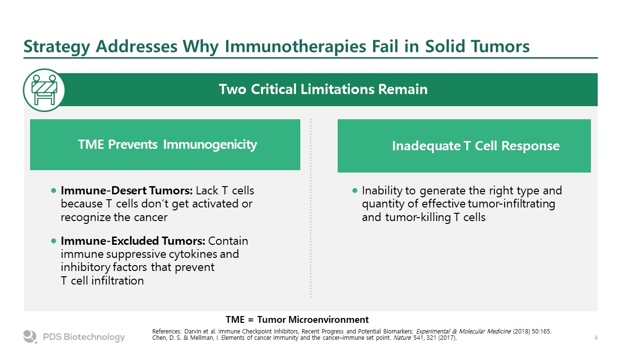 Strategy Addresses Why Immunotherapies Fail in Solid Tumors  References: Darvin et al. Immune Checkpoint Inhibitors, Recent Progress and Potential Biomarkers; Experimental & Molecular Medicine (2018) 50:165. Chen, D. S. & Mellman, I. Elements of cancer immunity and the cancer–immune set point. Nature 541, 321 (2017).   Two Critical Limitations Remain  Inability to generate the right type and quantity of effective tumor-infiltrating and tumor-killing T cells  Inadequate T Cell Response  Immune-Desert Tumors: Lack T cells because T cells don’t get activated or recognize the cancer   Immune-Excluded Tumors: Contain immune suppressive cytokines and inhibitory factors that prevent T cell infiltration   TME Prevents Immunogenicity   TME = Tumor Microenvironment