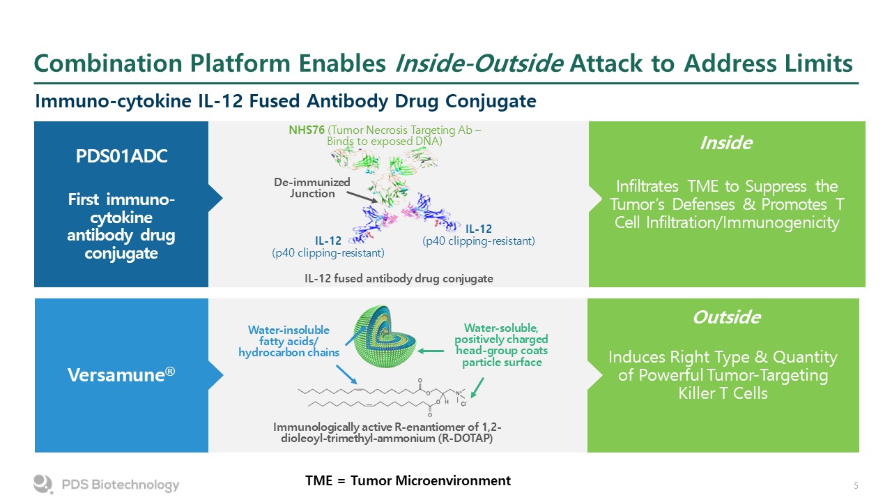 Infiltrates TME to Suppress the Tumor’s Defenses & Promotes T Cell Infiltration/Immunogenicity  Combination Platform Enables Inside-Outside Attack to Address Limits  Immuno-cytokine IL-12 Fused Antibody Drug Conjugate  PDS01ADC   First immuno-cytokine antibody drug conjugate  NHS76 (Tumor Necrosis Targeting Ab – Binds to exposed DNA)  De-immunized Junction  IL-12  (p40 clipping-resistant)  IL-12  (p40 clipping-resistant)  IL-12 fused antibody drug conjugate  TME = Tumor Microenvironment  Induces Right Type & Quantity of Powerful Tumor-Targeting Killer T Cells  Versamune®  Water-insoluble fatty acids/ hydrocarbon chains  Water-soluble, positively charged head-group coats particle surface  Immunologically active R-enantiomer of 1,2-dioleoyl-trimethyl-ammonium (R-DOTAP)  Inside  Outside