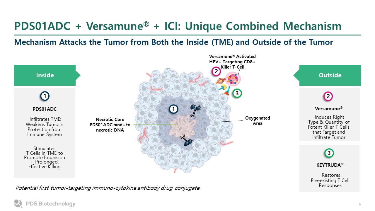 PDS01ADC + Versamune® + ICI: Unique Combined Mechanism  Mechanism Attacks the Tumor from Both the Inside (TME) and Outside of the Tumor  Inside  1  PDS01ADC   Infiltrates TME; Weakens Tumor’s Protection from Immune System   StimulatesT Cells in TME to Promote Expansion + Prolonged, Effective Killing  Versamune®   Induces Right Type & Quantity of Potent Killer T Cells that Target and Infiltrate Tumor  Outside  2  KEYTRUDA®   Restores Pre-existing T Cell Responses  3  Potential first tumor-targeting immuno-cytokine antibody drug conjugate  1  2  3  Necrotic Core PDS01ADC binds to necrotic DNA  Oxygenated Area  Versamune® Activated HPV+ Targeting CD8+ Killer T-Cell