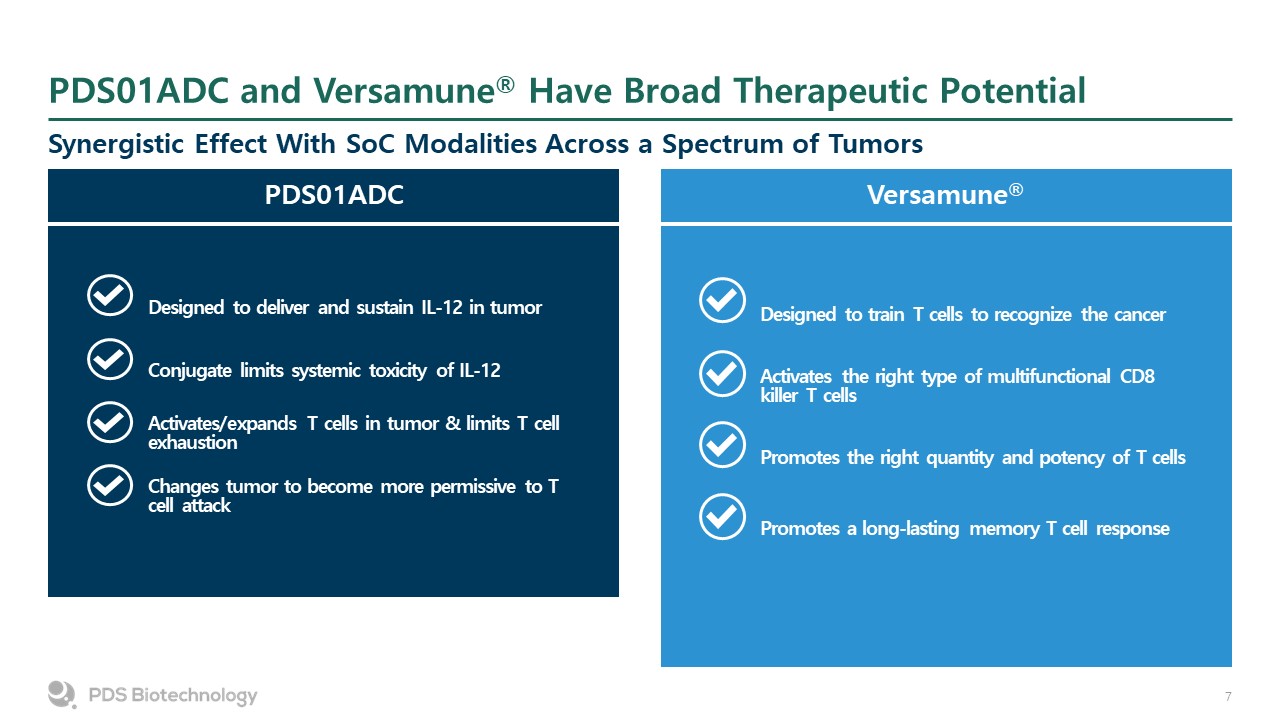 PDS01ADC and Versamune® Have Broad Therapeutic Potential  Synergistic Effect With SoC Modalities Across a Spectrum of Tumors  PDS01ADC  Versamune®  Conjugate limits systemic toxicity of IL-12  Activates/expands T cells in tumor & limits T cell exhaustion  Changes tumor to become more permissive to T cell attack  Designed to deliver and sustain IL-12 in tumor  Activates the right type of multifunctional CD8 killer T cells  Promotes the right quantity and potency of T cells  Promotes a long-lasting memory T cell response  Designed to train T cells to recognize the cancer