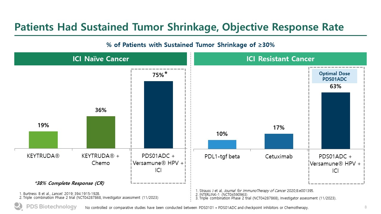 Patients Had Sustained Tumor Shrinkage, Objective Response Rate  ICI Resistant Cancer  1. Burtness B et al., Lancet. 2019; 394:1915-1928.  2. Triple combination Phase 2 trial (NCT04287868, Investigator assessment (11/2023)  1. Strauss J et al, Journal for ImmunoTherapy of Cancer 2020;8:e001395.  2. INTERLINK-1 (NCT04590963)  3. Triple combination Phase 2 trial (NCT04287868), Investigator assessment (11/2023).  ICI Naïve Cancer  Optimal Dose  PDS01ADC  % of Patients with Sustained Tumor Shrinkage of ≥30%  No controlled or comparative studies have been conducted between PDS0101 + PDS01ADC and checkpoint inhibitors or Chemotherapy.  *  *38% Complete Response (CR)