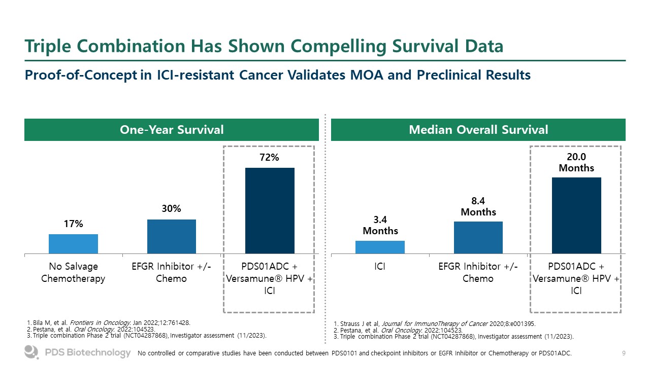Triple Combination Has Shown Compelling Survival Data  Proof-of-Concept in ICI-resistant Cancer Validates MOA and Preclinical Results  One-Year Survival  Median Overall Survival  1. Strauss J et al, Journal for ImmunoTherapy of Cancer 2020;8:e001395.  2. Pestana, et al. Oral Oncology. 2022:104523.  3. Triple combination Phase 2 trial (NCT04287868), Investigator assessment (11/2023).  Bila M, et al. Frontiers in Oncology. Jan 2022;12:761428.   Pestana, et al. Oral Oncology. 2022:104523.   Triple combination Phase 2 trial (NCT04287868), Investigator assessment (11/2023).  No controlled or comparative studies have been conducted between PDS0101 and checkpoint inhibitors or EGFR Inhibitor or Chemotherapy or PDS01ADC.