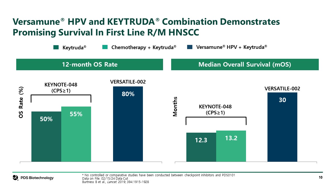 Versamune® HPV and KEYTRUDA® Combination Demonstrates Promising Survival In First Line R/M HNSCC  * No controlled or comparative studies have been conducted between checkpoint inhibitors and PDS0101Data on File. 02/15/24 Data CutBurtness B et al., Lancet. 2019; 394:1915-1928  OS Rate (%)  VERSATILE-002  VERSATILE-002  KEYNOTE-048(CPS≥1)  KEYNOTE-048(CPS≥1)  12-month OS Rate  Median Overall Survival (mOS)  Keytruda®  Chemotherapy + Keytruda®  Versamune® HPV + Keytruda®  Months