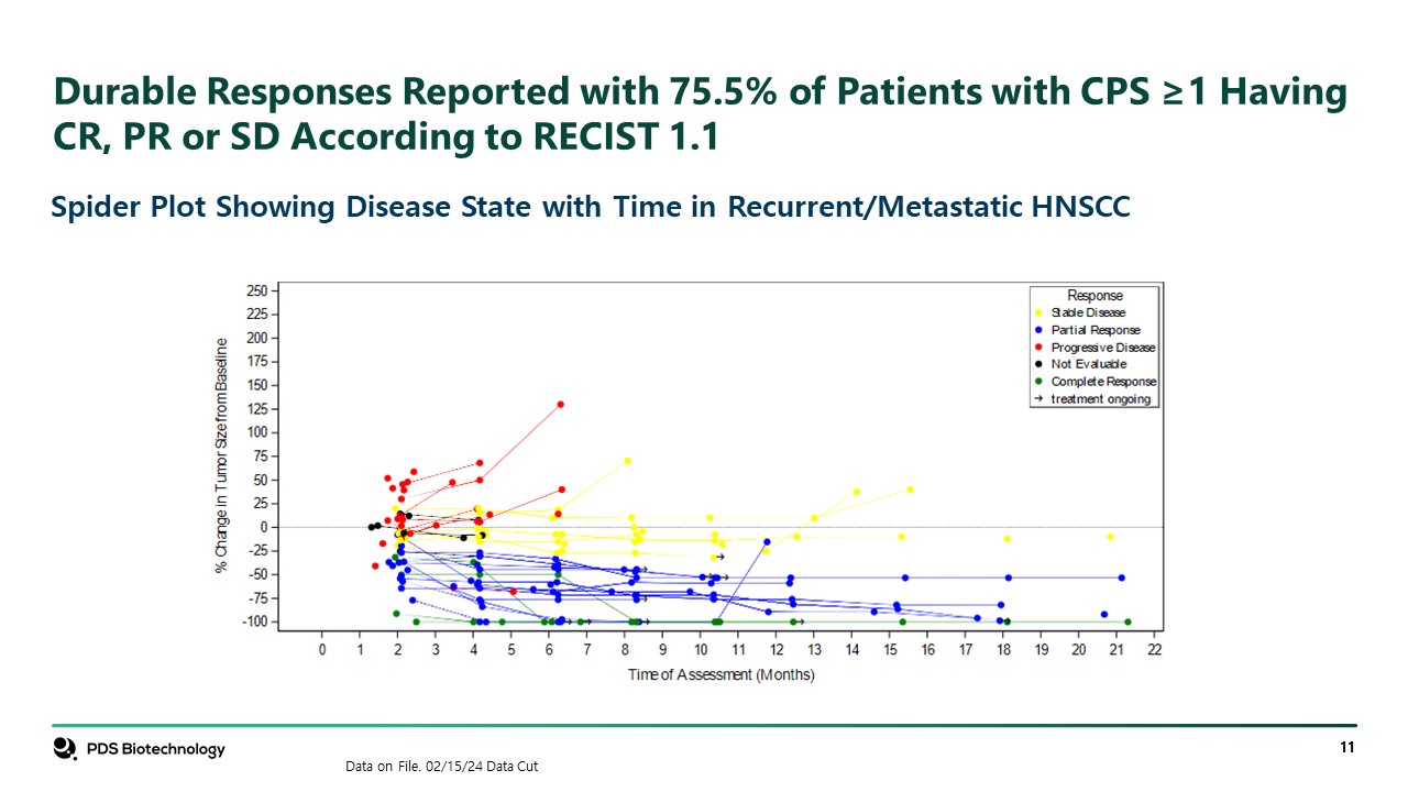 Durable Responses Reported with 75.5% of Patients with CPS ≥1 Having CR, PR or SD According to RECIST 1.1  Spider Plot Showing Disease State with Time in Recurrent/Metastatic HNSCC  Data on File. 02/15/24 Data Cut