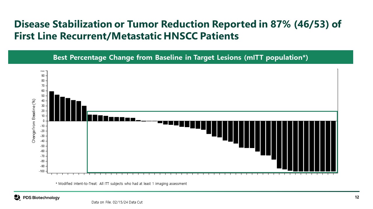Disease Stabilization or Tumor Reduction Reported in 87% (46/53) of First Line Recurrent/Metastatic HNSCC Patients  * Modified Intent-to-Treat: All ITT subjects who had at least 1 imaging assessment  Best Percentage Change from Baseline in Target Lesions (mITT population*)  Data on File. 02/15/24 Data Cut