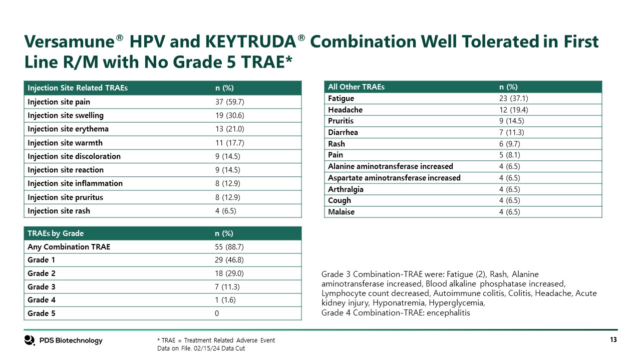 Versamune® HPV and KEYTRUDA® Combination Well Tolerated in First Line R/M with No Grade 5 TRAE*  Injection Site Related TRAEs  n (%)  Injection site pain  37 (59.7)  Injection site swelling  19 (30.6)  Injection site erythema  13 (21.0)  Injection site warmth  11 (17.7)  Injection site discoloration  9 (14.5)  Injection site reaction  9 (14.5)  Injection site inflammation  8 (12.9)  Injection site pruritus  8 (12.9)  Injection site rash  4 (6.5)  All Other TRAEs  n (%)  Fatigue  23 (37.1)  Headache  12 (19.4)  Pruritis  9 (14.5)  Diarrhea  7 (11.3)  Rash  6 (9.7)  Pain  5 (8.1)  Alanine aminotransferase increased  4 (6.5)  Aspartate aminotransferase increased  4 (6.5)  Arthralgia  4 (6.5)  Cough  4 (6.5)  Malaise  4 (6.5)  * TRAE = Treatment Related Adverse Event  Data on File. 02/15/24 Data Cut  TRAEs by Grade  n (%)  Any Combination TRAE  55 (88.7)  Grade 1  29 (46.8)  Grade 2  18 (29.0)  Grade 3  7 (11.3)  Grade 4  1 (1.6)  Grade 5  0  Grade 3 Combination-TRAE were: Fatigue (2), Rash, Alanine aminotransferase increased, Blood alkaline phosphatase increased, Lymphocyte count decreased, Autoimmune colitis, Colitis, Headache, Acute kidney injury, Hyponatremia, Hyperglycemia,   Grade 4 Combination-TRAE: encephalitis